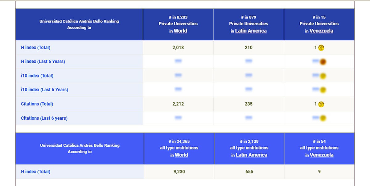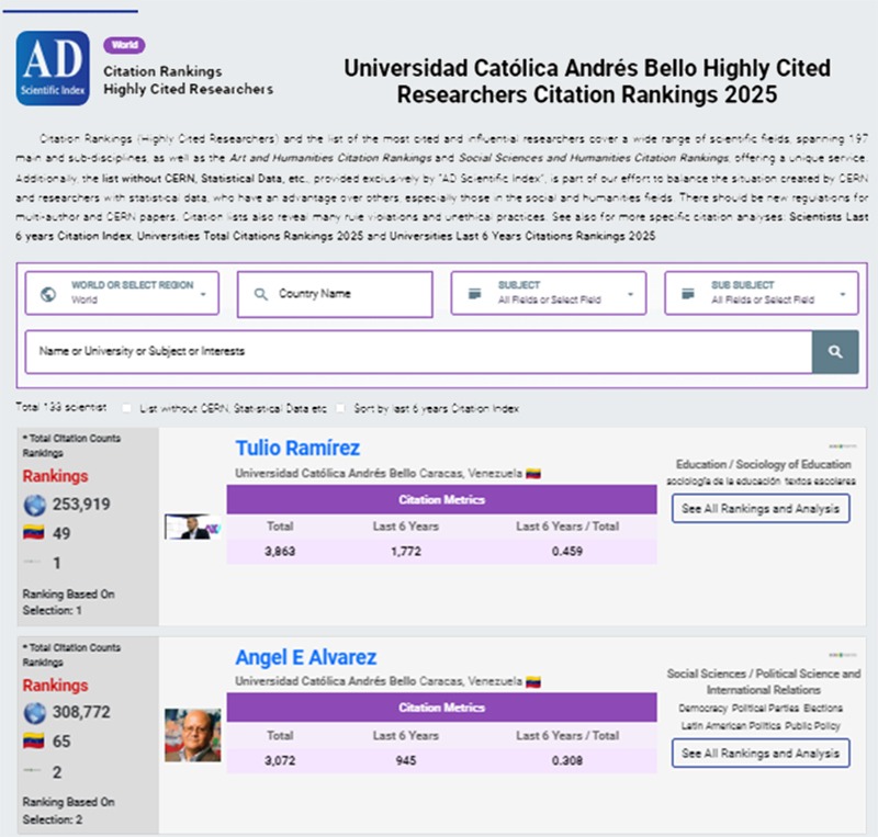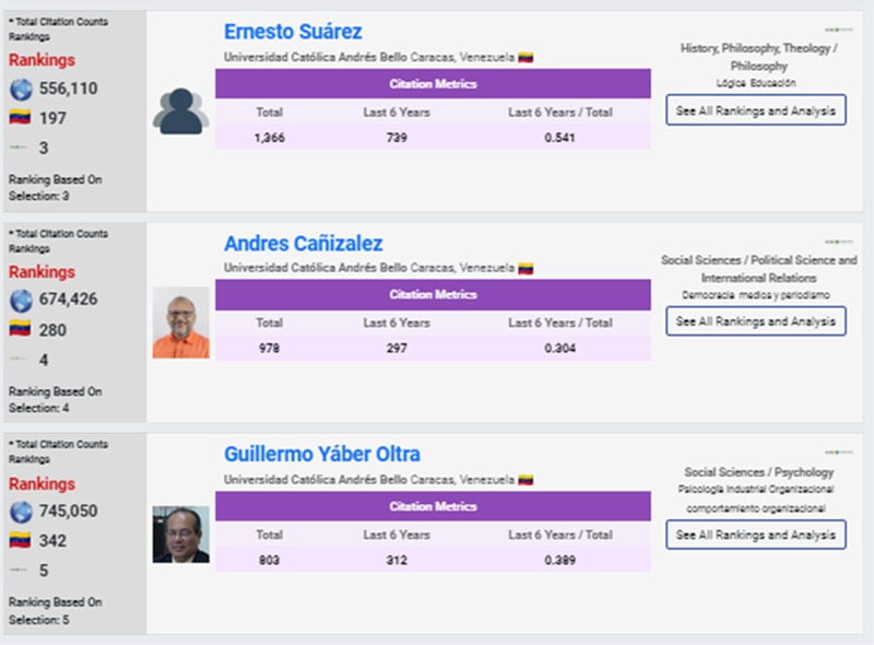 Al considerar la «clasificación total del índice H», el profesor Ángel Álvarez sube al primer lugar de la lista de investigadores de la UCAB, y los investigadores del Instituto de Investigaciones Económicas y Sociales (IIES), responsables del conocido Proyecto Encovi (Encuesta Nacional de Condiciones de Vida), escalan puestos en la clasificación.