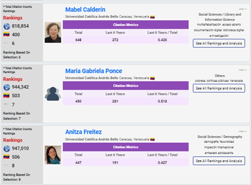 - Anitza Freitez (ciencias sociales, demografía, fecundidad, migración internacional, embarazo adolescente). Ocupa la posición #506 entre investigadores del país.