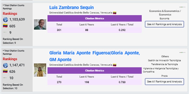 - Luis Zambrano Sequín (economía y econometría). Tiene el puesto #605 en Venezuela.