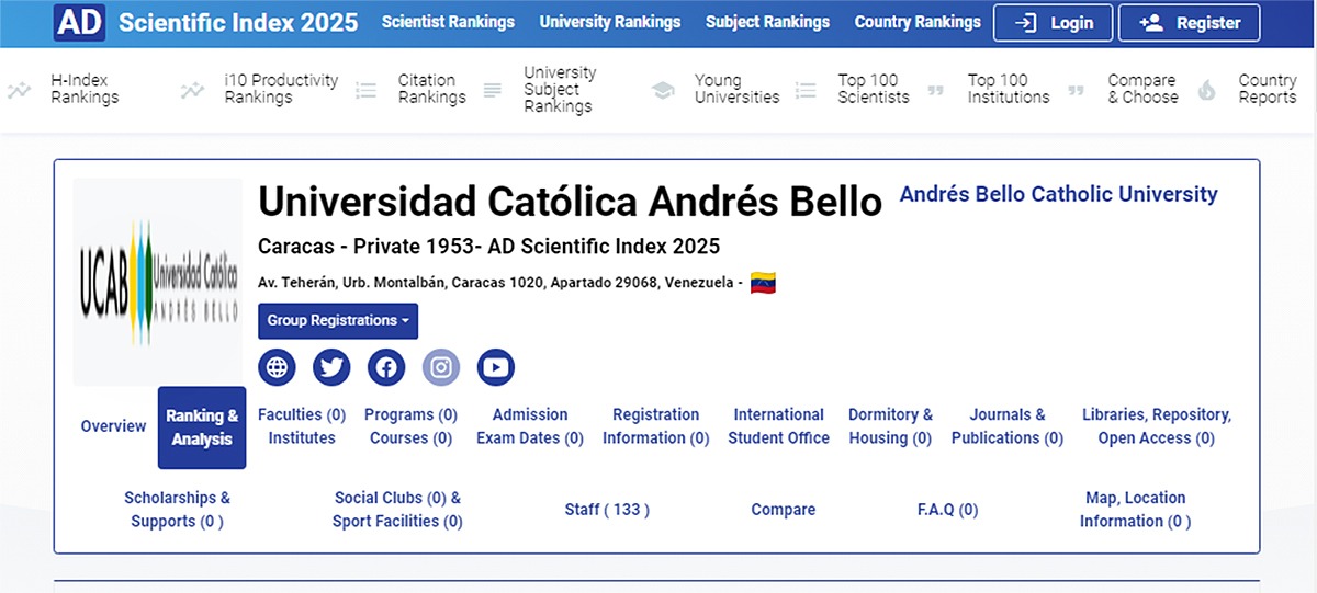 La Universidad Católica Andrés Bello alcanzó el puesto 9 entre 57 institutos y centros de investigación de Venezuela, lista que encabeza el Instituto Venezolano de Investigaciones Científicas (IVIC). Esto según el informe del AD Scientific Index 2025, que clasifica la productividad, eficiencia e impacto de la producción intelectual de los investigadores universitarios de todo el mundo.