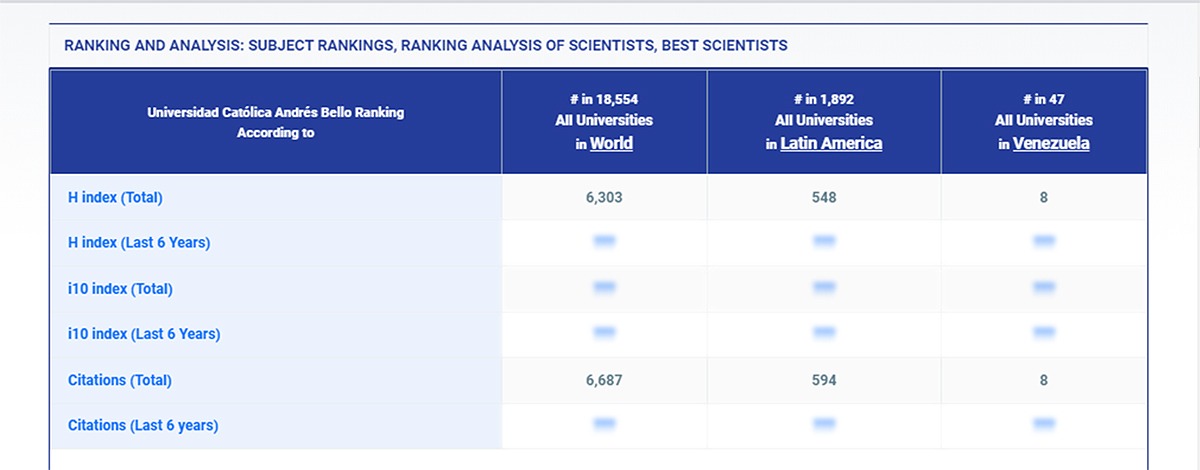 El ranking clasifica la productividad e impacto científico de los investigadores de más de 24.000 instituciones académicas en el mundo. La reciente edición ubica a la UCAB en el primer lugar entre las universidades privadas de Venezuela y en el N° 8 entre todas las casas de estudio superior del país. En el listado aparecieron 133 expertos ucabistas, 85 más que en el informe de 2024