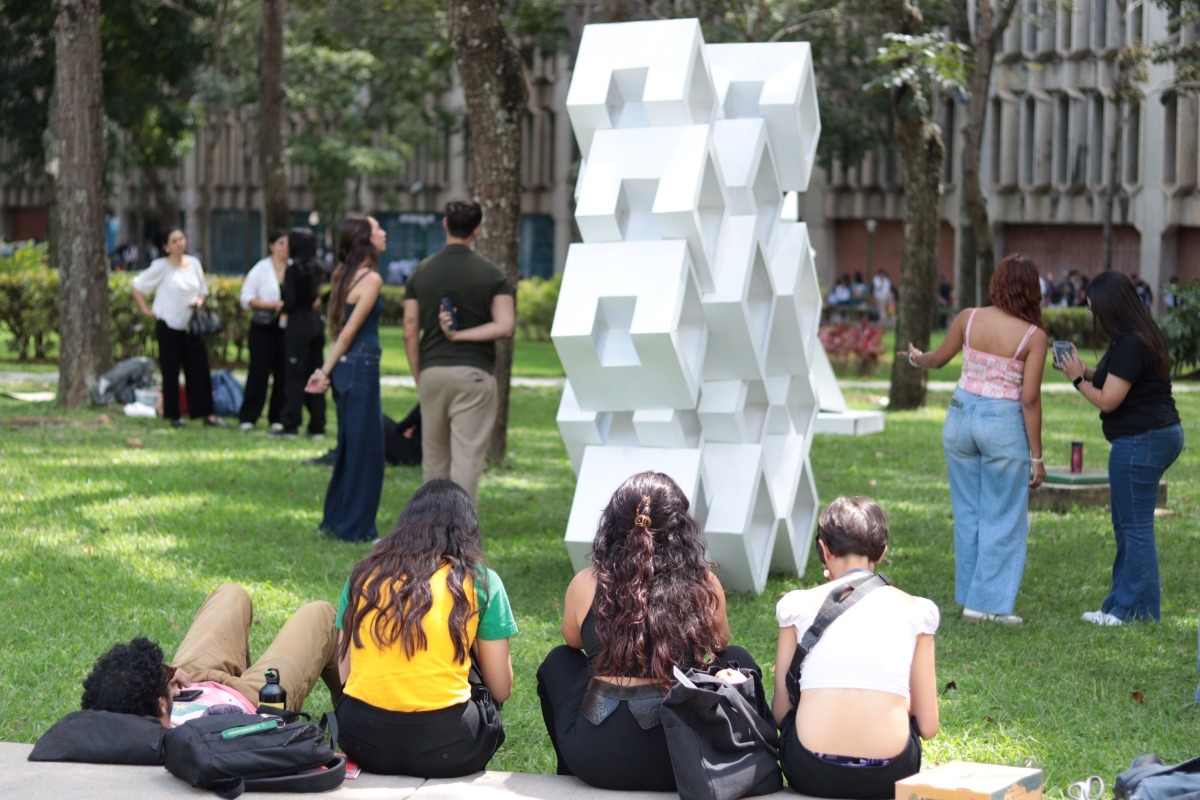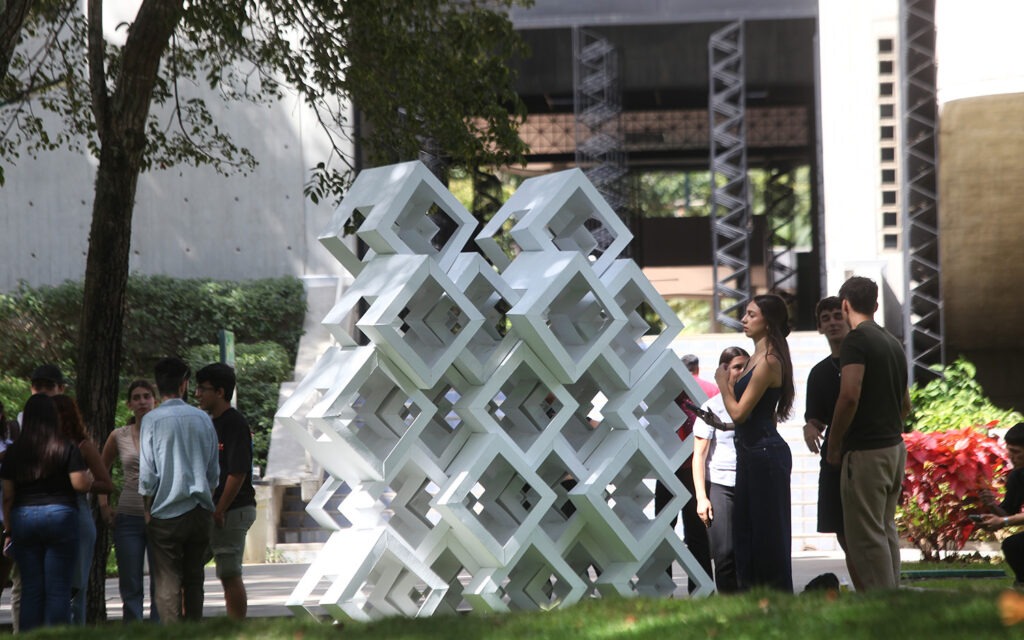 Las piezas geométricas modulares a escala 1:10 fueron realizadas por 53 alumnos de las certificaciones en Diseño Gráfico, Industrial y de Interiores. Ubicadas inicialmente en los jardines, las estructuras pasarán al edificio Cincuentenario. El director de la Academia invitó a inscribirse en la segunda cohorte de sus programas formativos