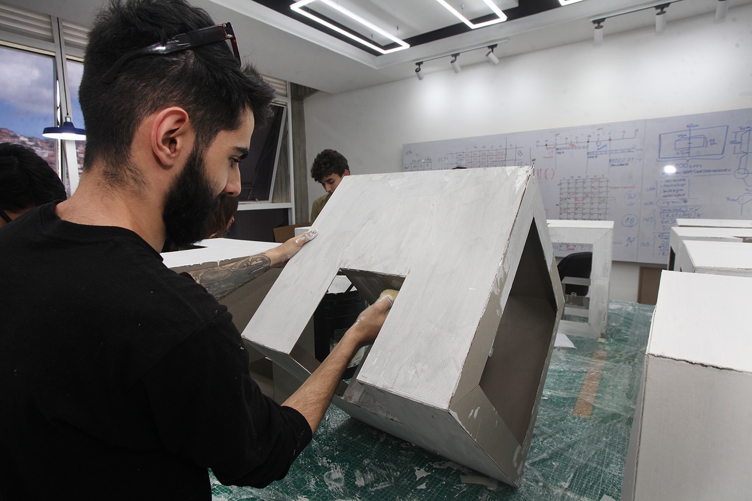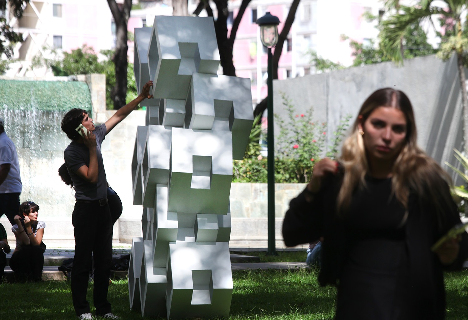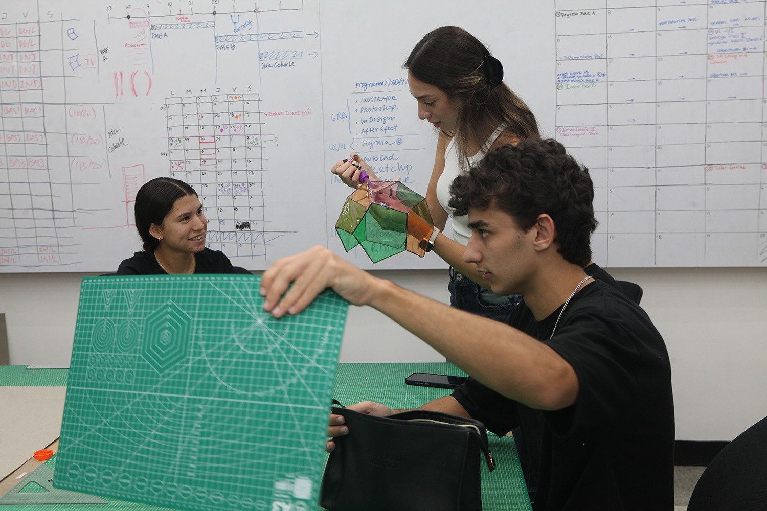 Las piezas geométricas modulares a escala 1:10 fueron realizadas por 53 alumnos de las certificaciones en Diseño Gráfico, Industrial y de Interiores. Ubicadas inicialmente en los jardines, las estructuras pasarán al edificio Cincuentenario. El director de la Academia invitó a inscribirse en la segunda cohorte de sus programas formativos