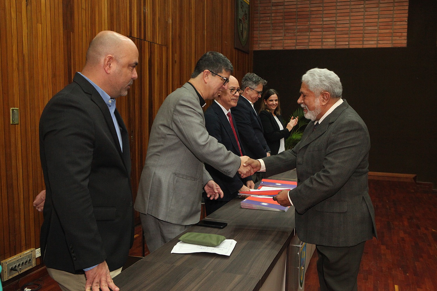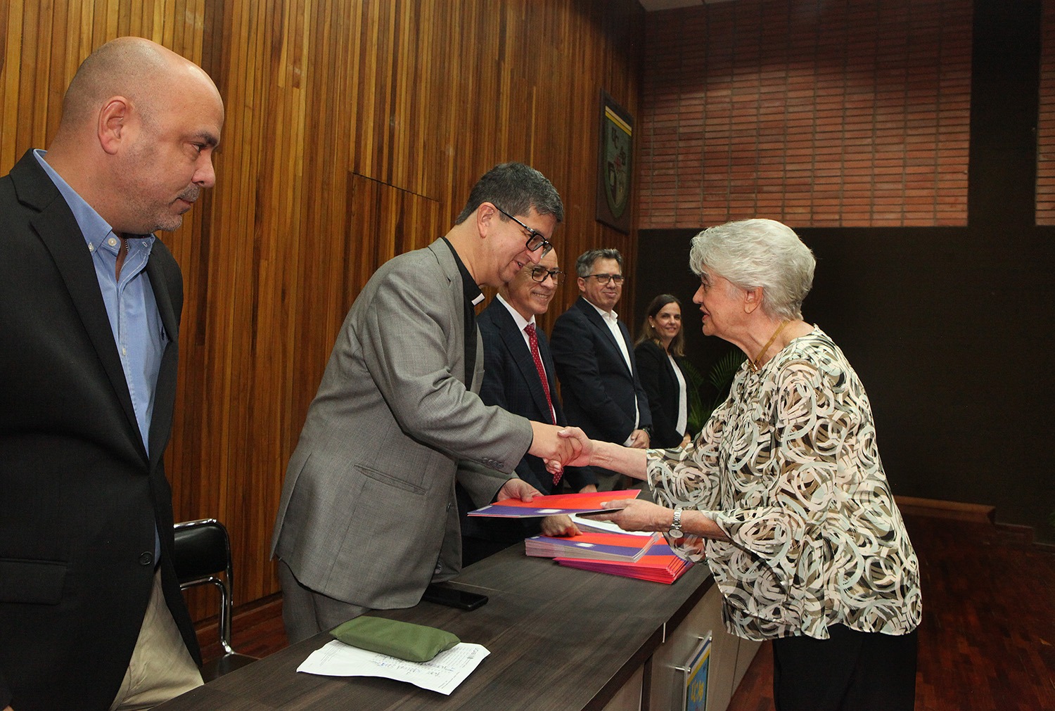 Presidieron el acto el rector Arturo Peraza, S.J.; Gustavo García, vicerrector administrativo; José Francisco Juárez, vicerrector académico; Néstor Luis Luengo, vicerrector de Identidad, Desarrollo Estudiantil y Extensión Social, y la secretaria general, Magaly Vásquez. Les acompañó Elizabeth (Betty) Fórmica, directora general de Recursos Humanos.