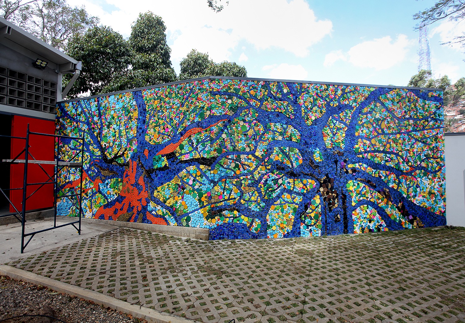 La ejecución de las coloridas obras, originales del joven artista venezolano Oscar Olivares, tomó cerca de un año de planificación y tres semanas de montaje, gracias a la reutilización de más de 100.000 tapas de envases plásticos (recolectadas en el campus Montalbán) y la colaboración de decenas de personas de la comunidad ucabista.