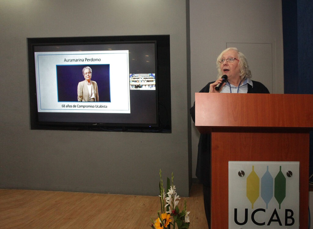 Aura Marina Perdomo -farmacéutica egresada de la Universidad Central de Venezuela- suma 68 años en la UCAB. Su camino en la universidad comenzó como docente en 1957, cuando la institución tenía sólo cuatro años de fundada y contaba con Facultad de Farmacia. Allí fundaría la cátedra Química III.