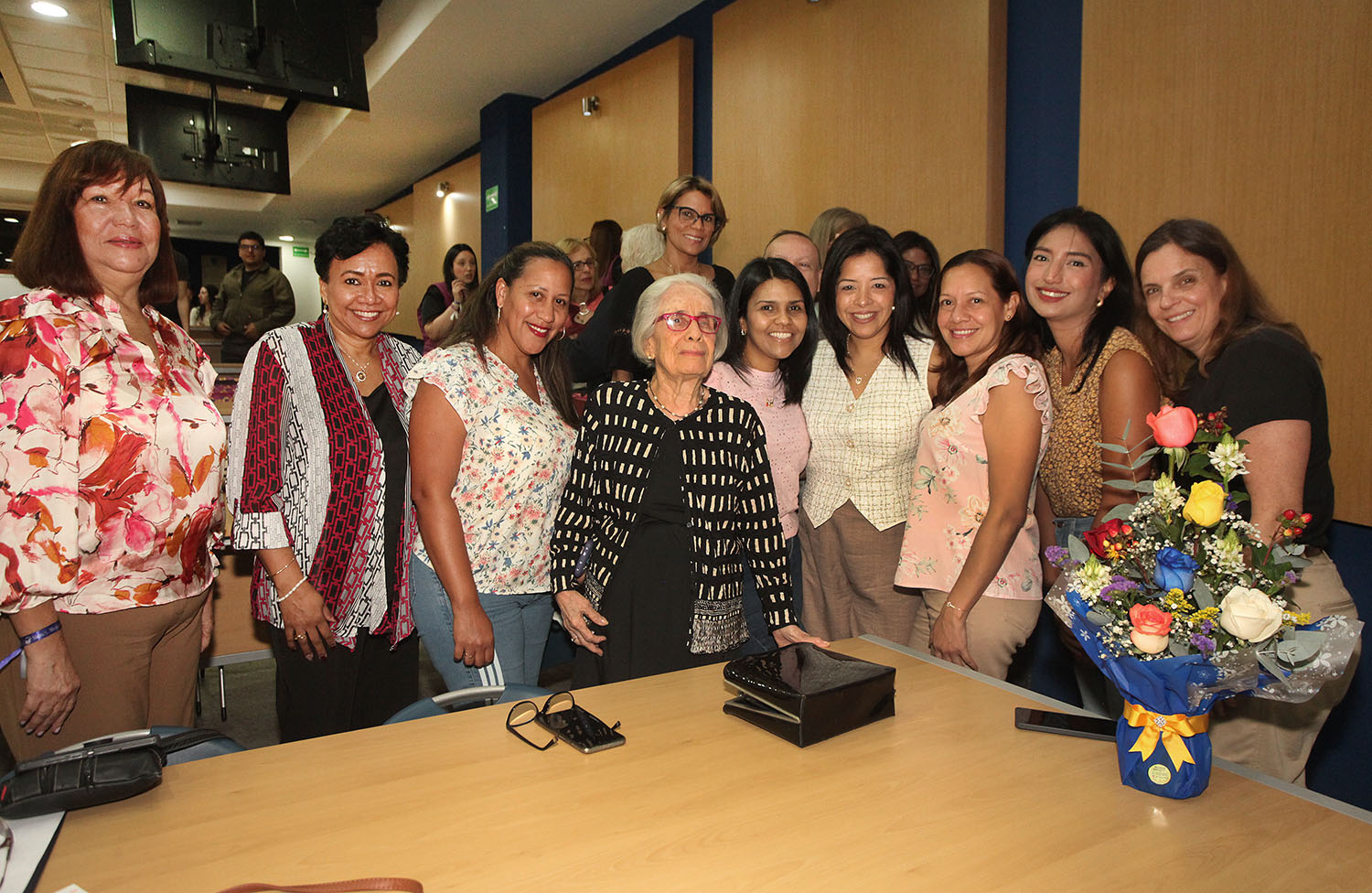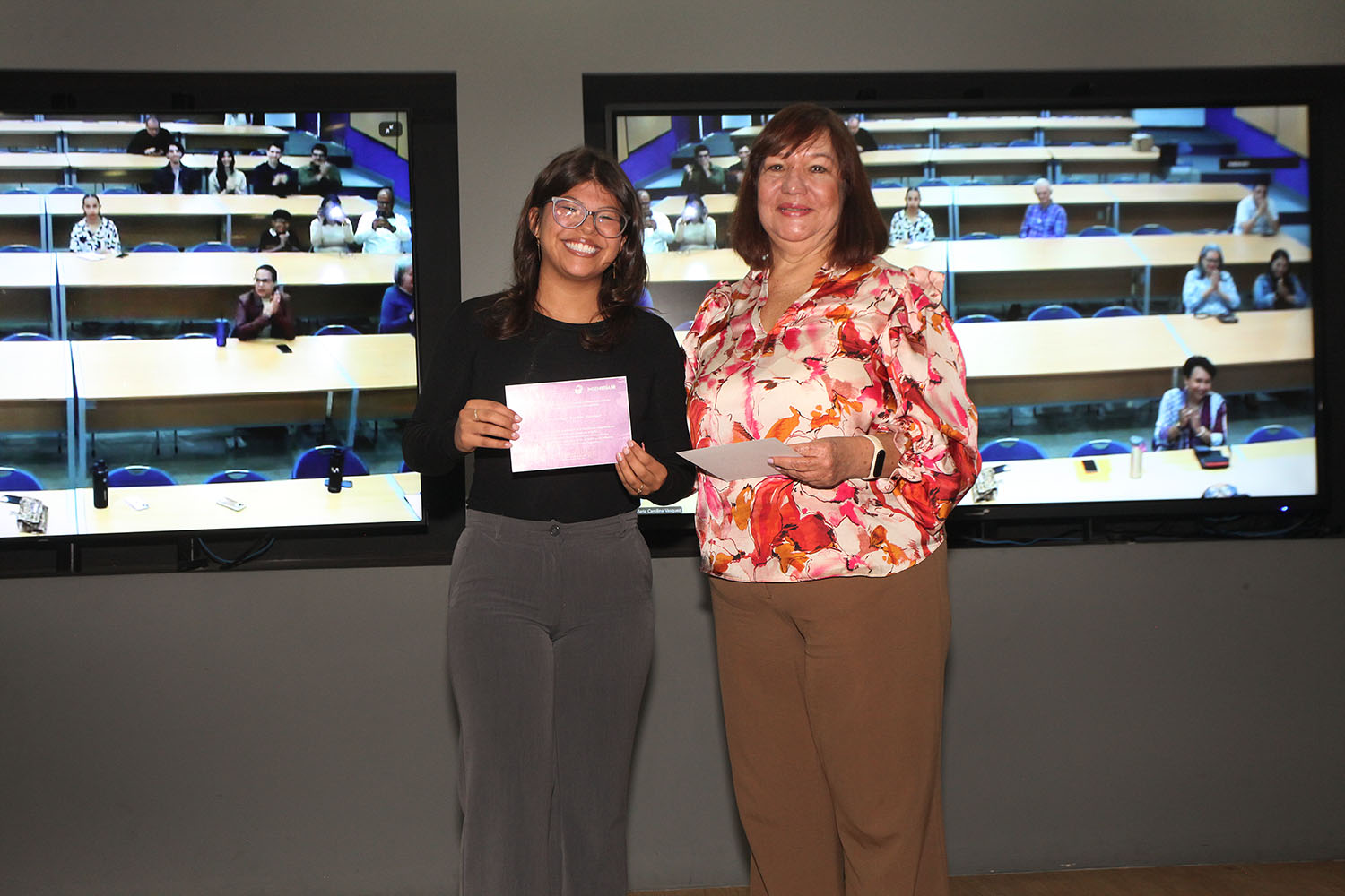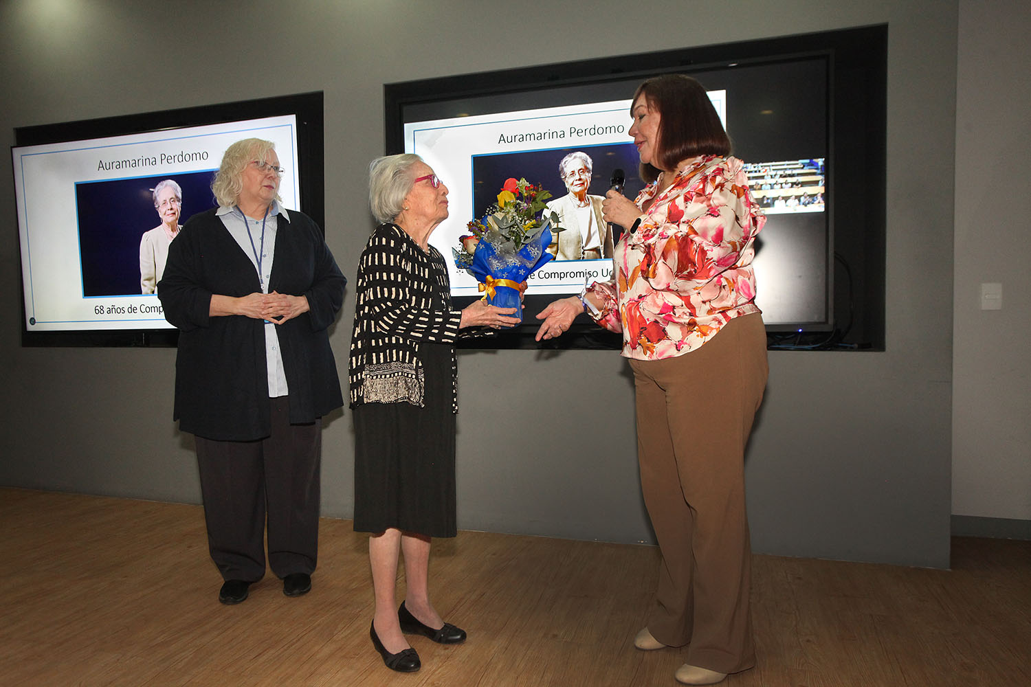 Emocionada por el reconocimiento, Perdomo se subió al escenario para recibir un ramo de flores de manos de la decana Narváez y un abrazo no solo de ella y de López, sino de varios de los presentes.
