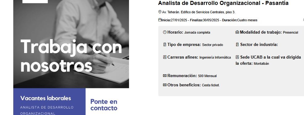 Para conocer más sobre el Portal de Pasantías y Primer Empleo de la UCAB sólo hay que hacer clic en https://primerempleo.ucab.edu.ve