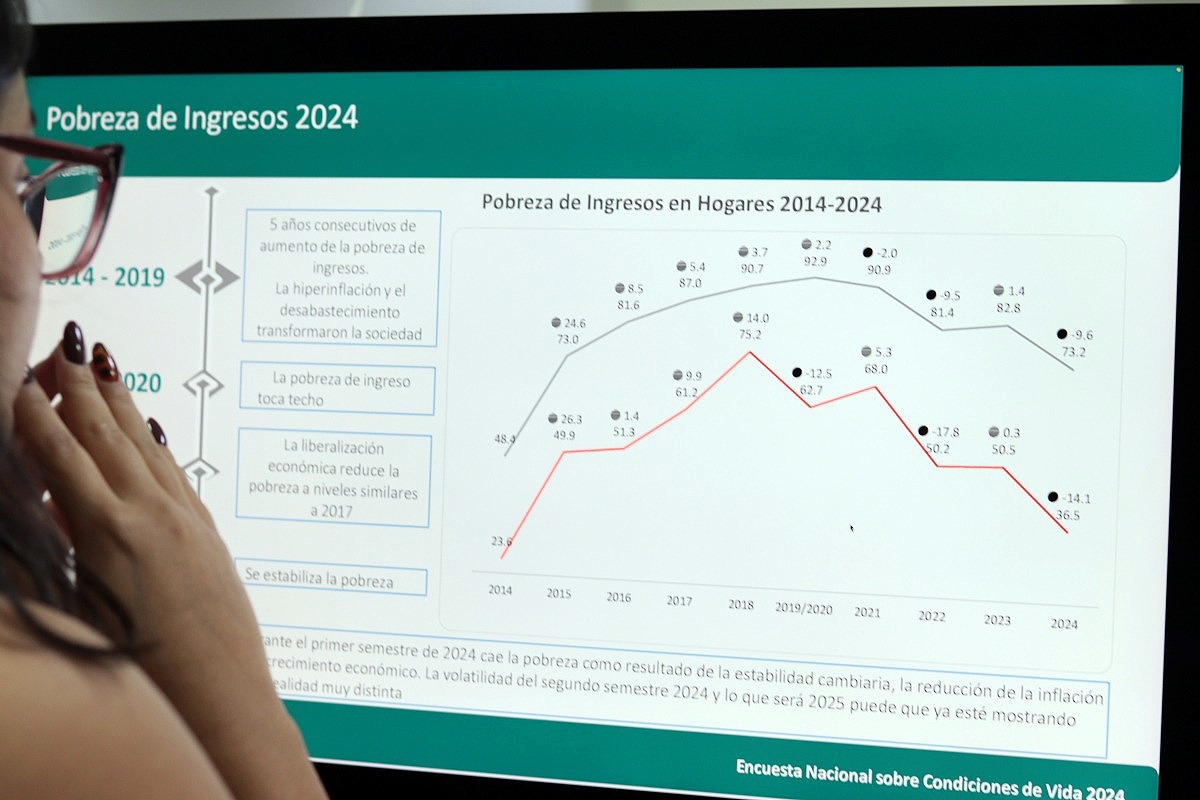 Según los datos del estudio, recogidos entre junio y julio del año pasado, para esa fecha siete de cada 10 hogares (73,2%) se encontraban en situación de pobreza de ingresos (recursos insuficientes para satisfacer necesidades básicas), una reducción de 9,6% respecto a la medición de 2023.