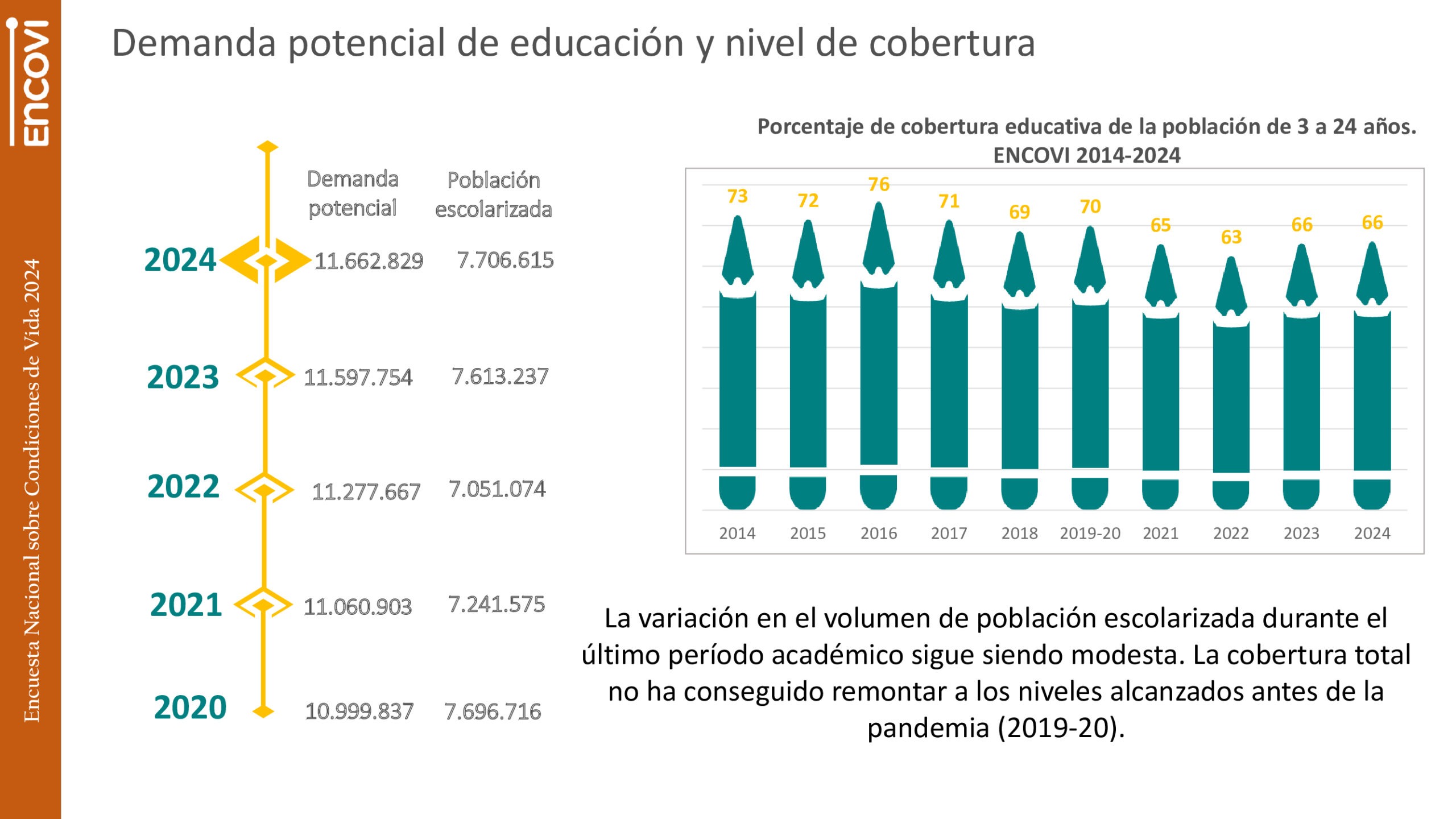 Las estimaciones de la ENCOVI señalan que, para 2024, la cobertura educativa nacional alcanzó 66%, lo que quiere decir que estaban escolarizados 7,7 millones de niños y jóvenes entre 3 y 24 años.