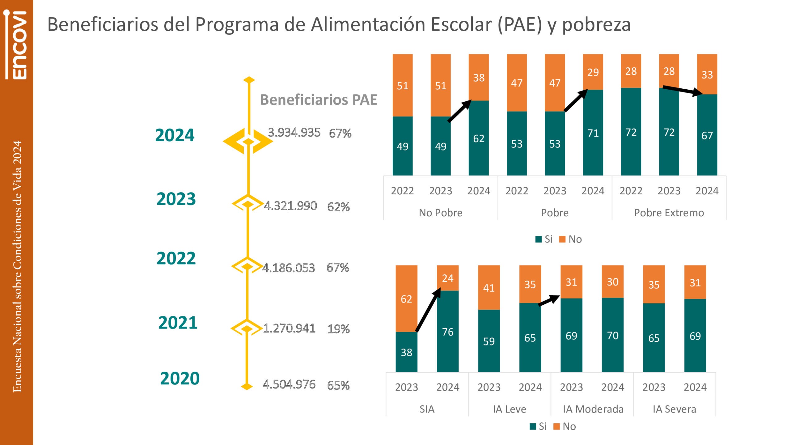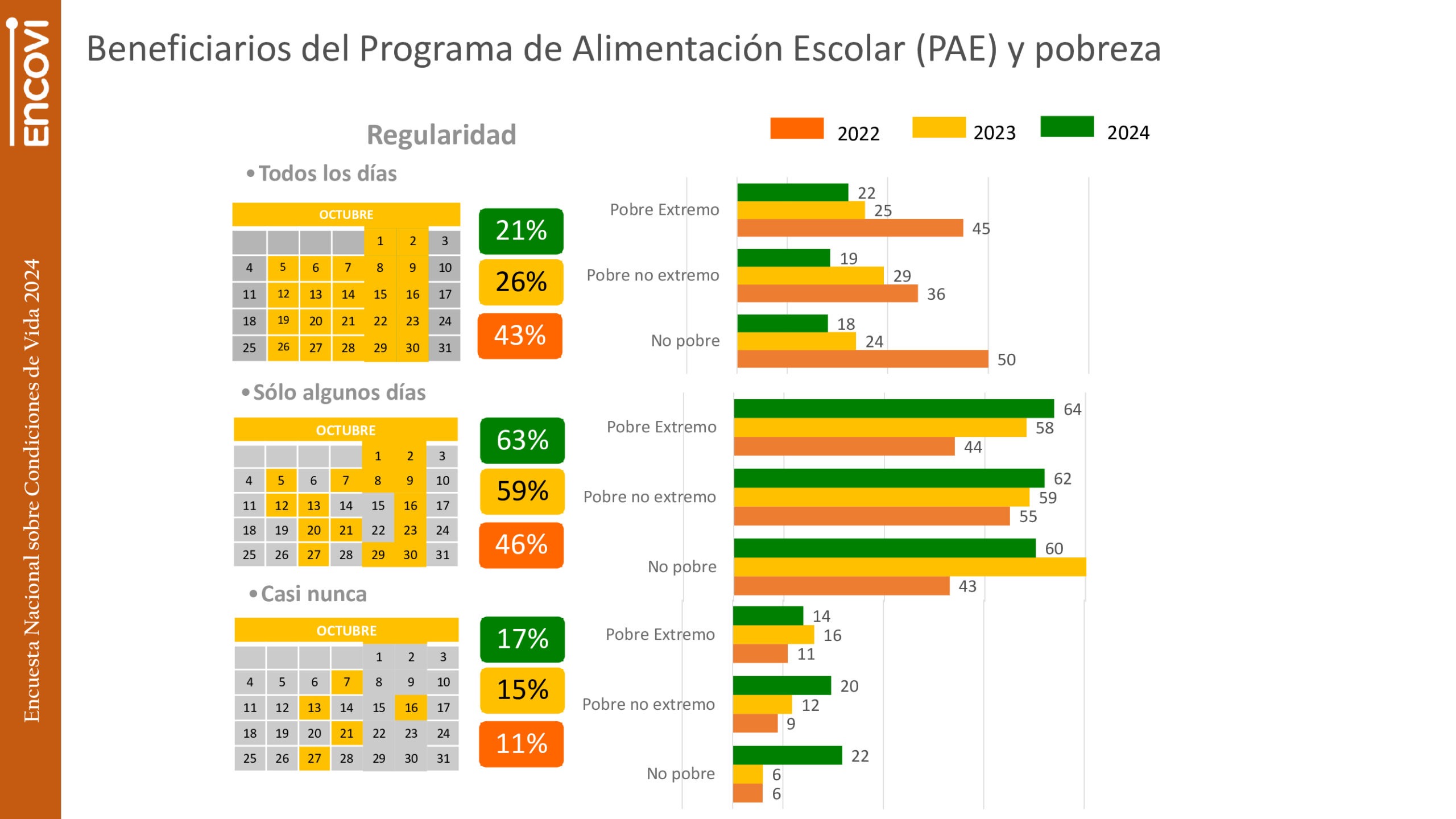 Los números de la ENCOVI reflejan que 67% de la población escolarizada lo recibía a mediados de 2024, lo que representa un aumento de 5 puntos respecto a 2023. Sin embargo, seis de cada 10 (63%) reportó contar con él sólo algunos días y 17% casi nunca. Solo el 21% dijo acceder al PAE diariamente.
