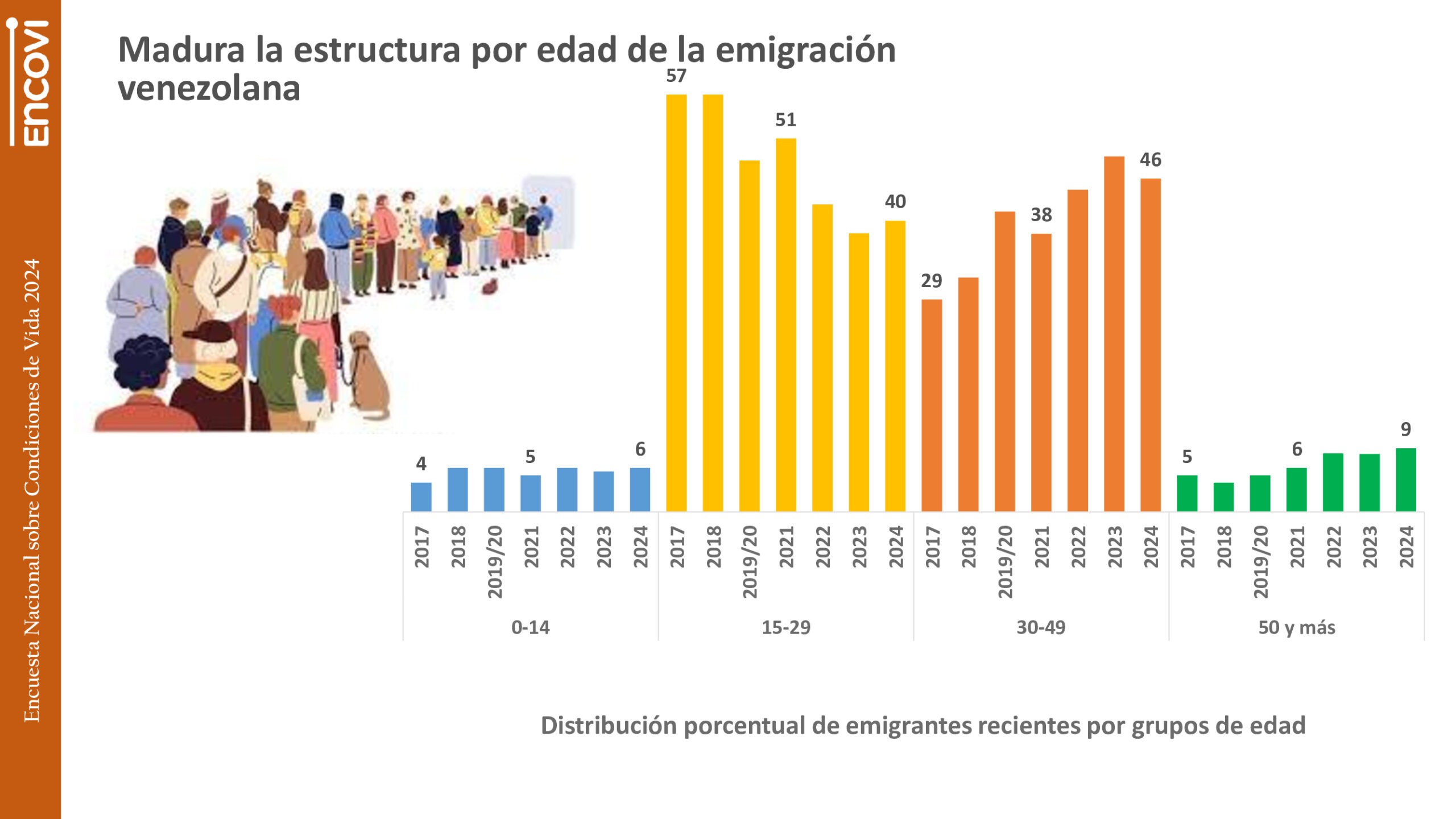 Mientras, en 2017, casi 6 de cada 10 migrantes (57%) eran jóvenes entre 15 y 29 años, para 2024 este grupo solo llegaba al 40%. En contraste, 46% de los que emigraron en 2024 tenían entre 30 y 49 años, versus el 29% que lo hizo en 2017.