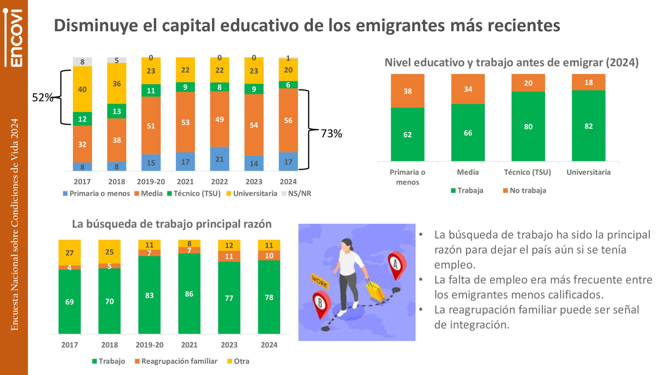 Un dato curioso es que, aunque la búsqueda de oportunidades laborales fue la principal razón para abandonar el país, más de la mitad de los que se fueron estaban trabajando en Venezuela antes de irse, independientemente de su nivel educativo (62% en el caso de los que tenían estudios de primaria y 82% en el caso de los universitarios).