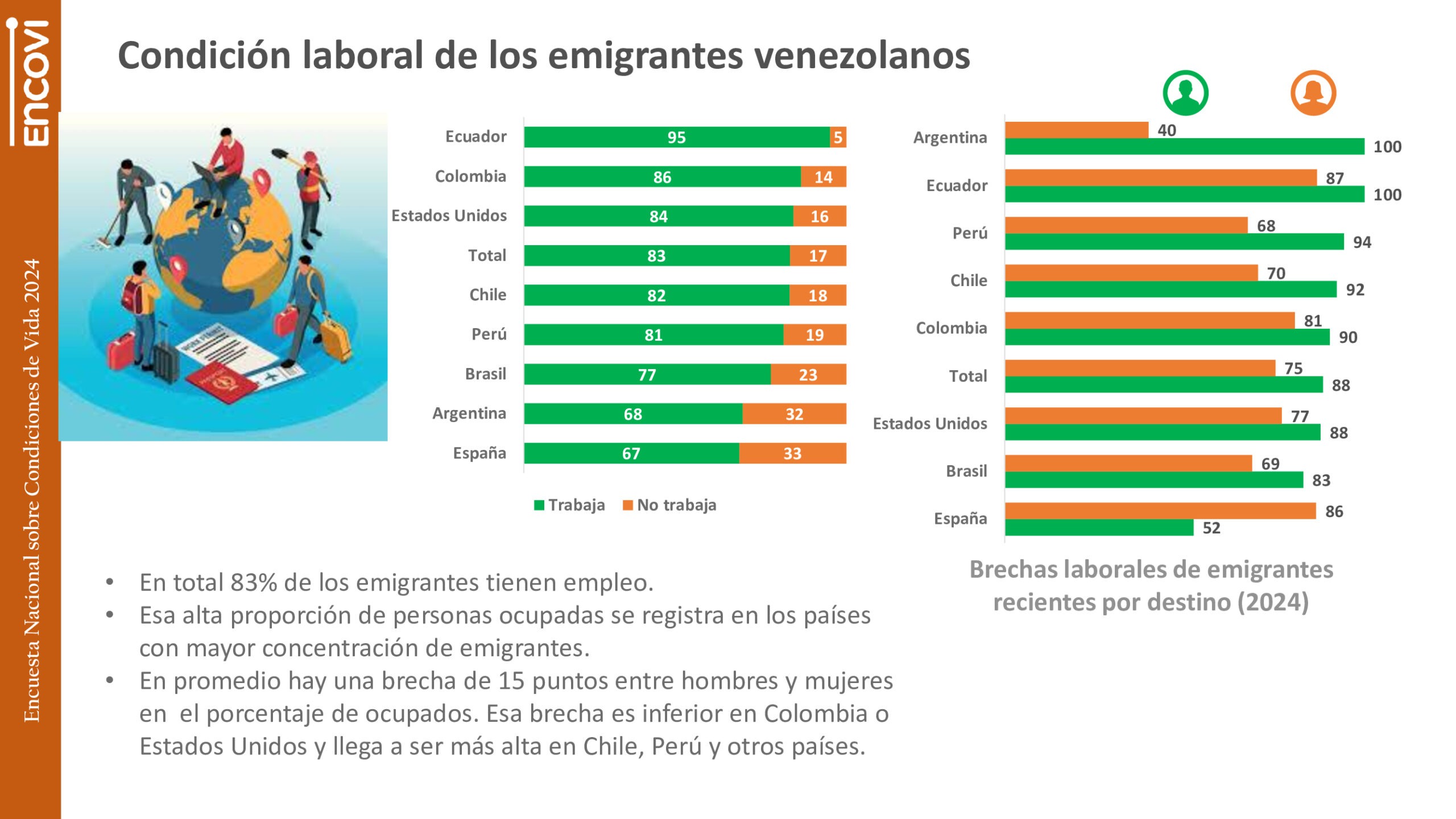 Por otra parte, la gran mayoría de los migrantes estaba trabajando. Sus familiares encuestados por la ENCOVI reportaron que 83% tenía empleo, una proporción que se registraba en los países con mayor concentración de emigrantes (95% Ecuador, 86% Colombia, 84% EEUU, 82% Chile y 81% Perú)