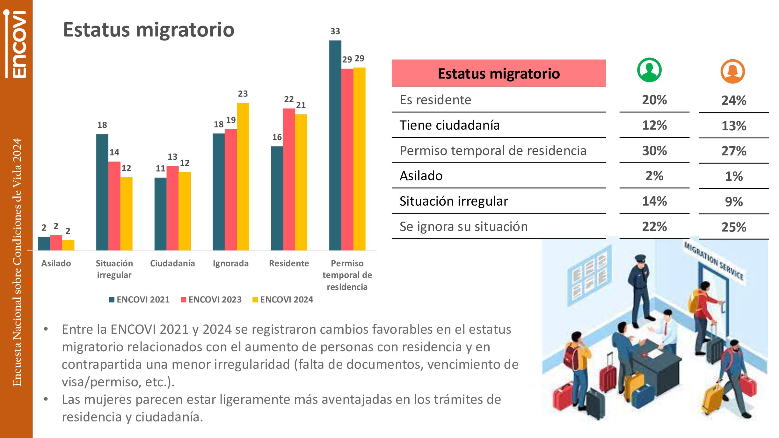 En referencia al estatus migratorio, 64% de los encuestados reportó que sus familiares se encontraban en situación regular, gracias a permisos temporales, asilo, residencia o ciudadanía.