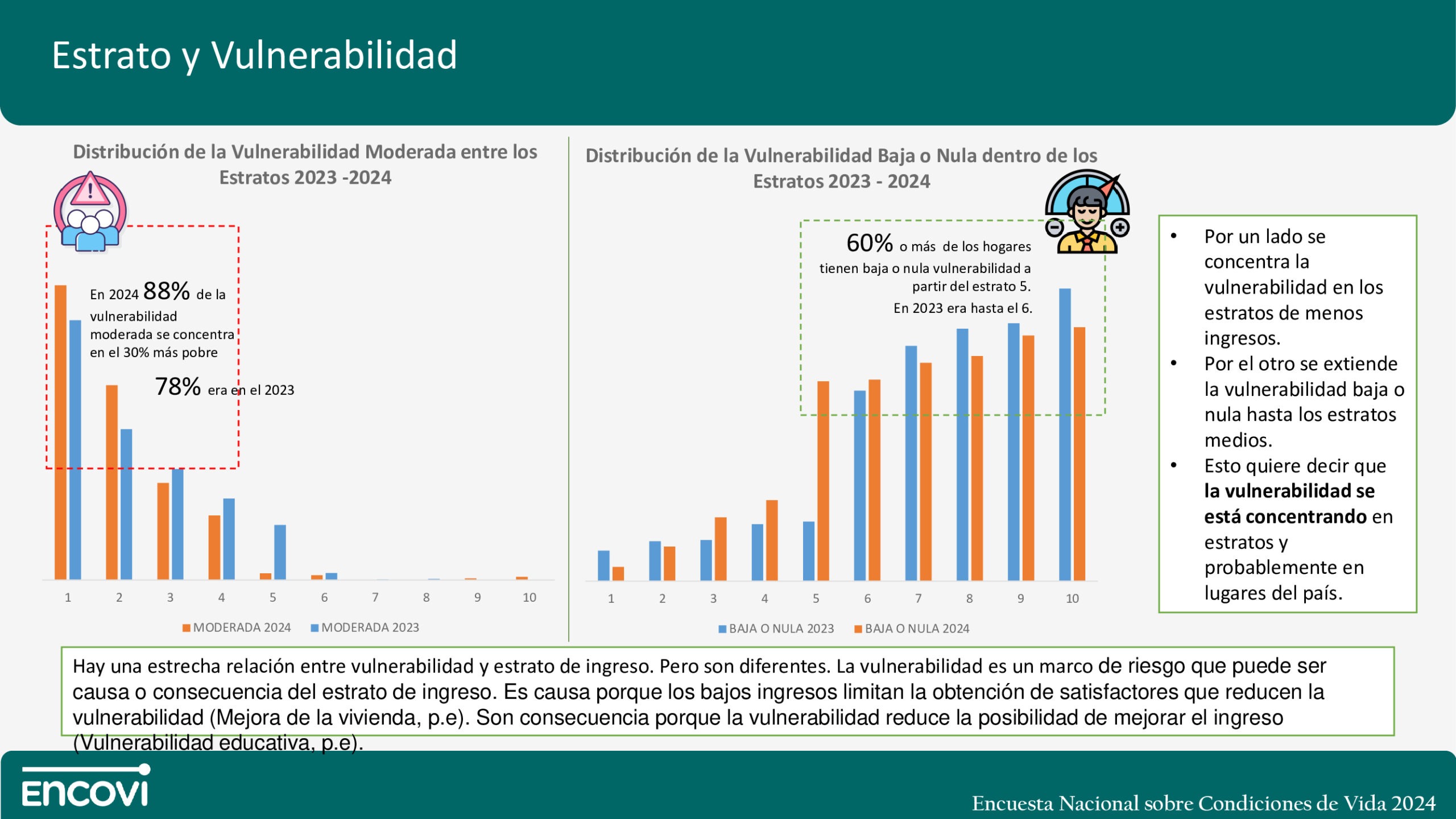 Los datos también precisan que 88% de la vulnerabilidad moderada se concentra en el 30% más pobre de la población. Por su parte, a partir del quinto estrato o decil de ingreso, 60% o más de los hogares tienen baja o nula vulnerabilidad.
