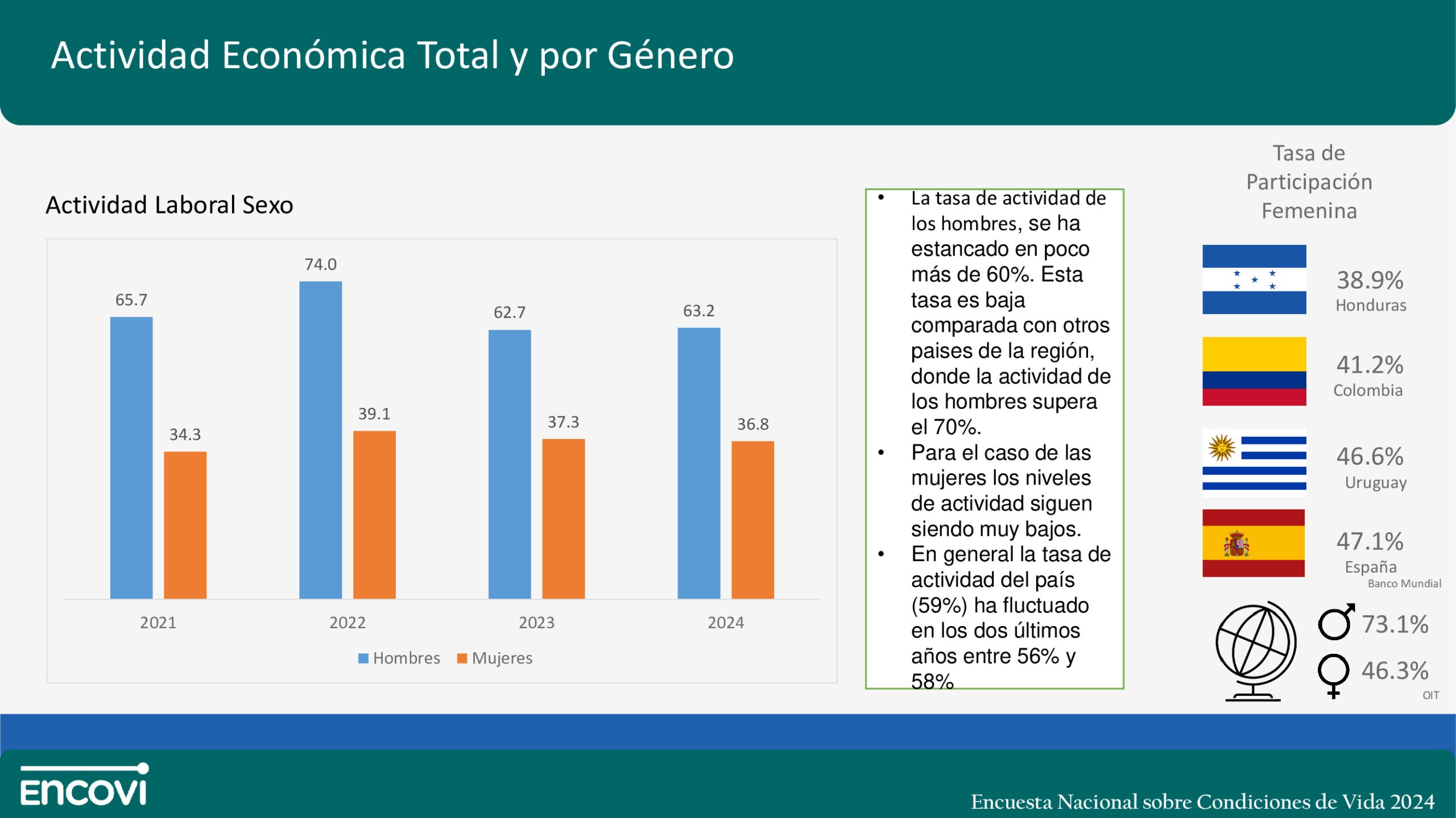 Ambas cifras se ubican 10 puntos por debajo del promedio mundial documentado por la Organización Internacional del Trabajo (73,1% en el caso de los hombres y 46,3% en el de las féminas).