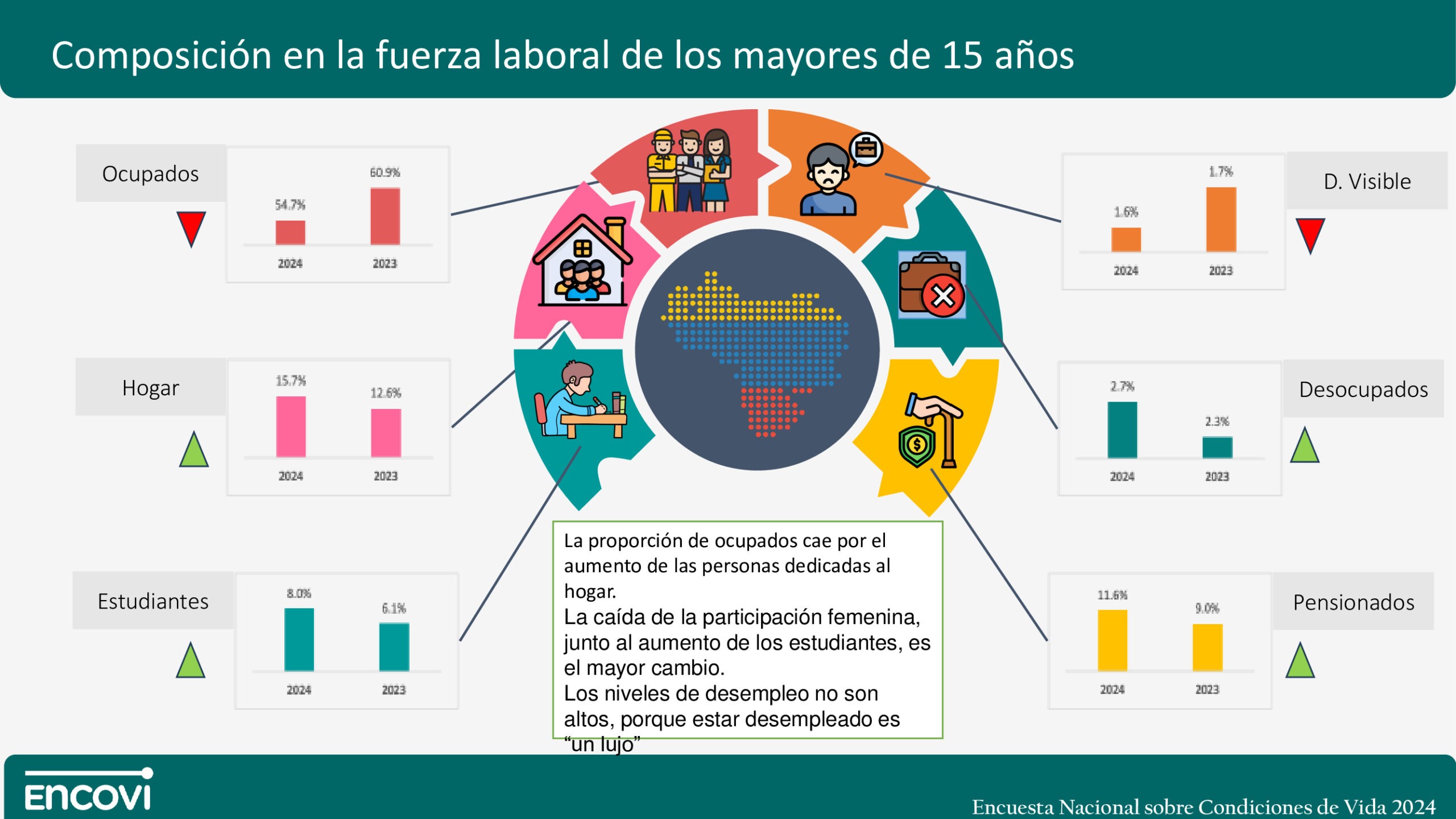 Entre 2023 y 2024, la encuesta registró una caída en la tasa de ocupados, la cual pasó de 60,9% a 54,7%, debido a un aumento en el número de personas dedicadas a labores del hogar (15,7% versus 12,6% en 2023).