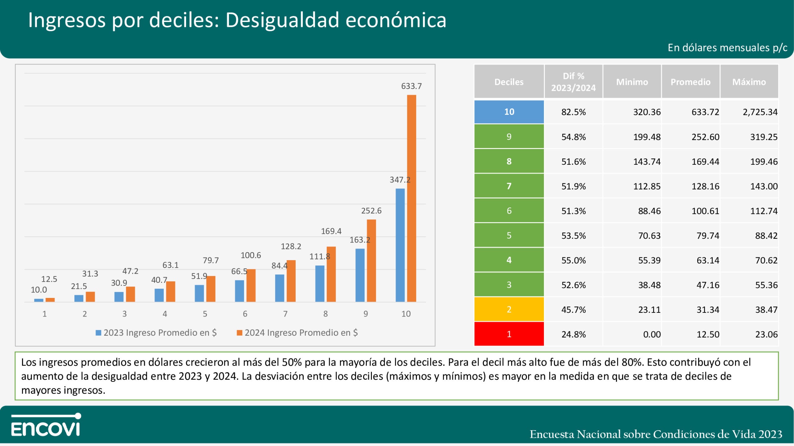 “Los ingresos promedios en dólares crecieron más del 50% para la mayoría de los deciles. Para el decil más alto fue de más del 80%, Esto contribuyó con el aumento de la desigualdad entre 2023 y 2024”, apunta el extracto de la investigación.