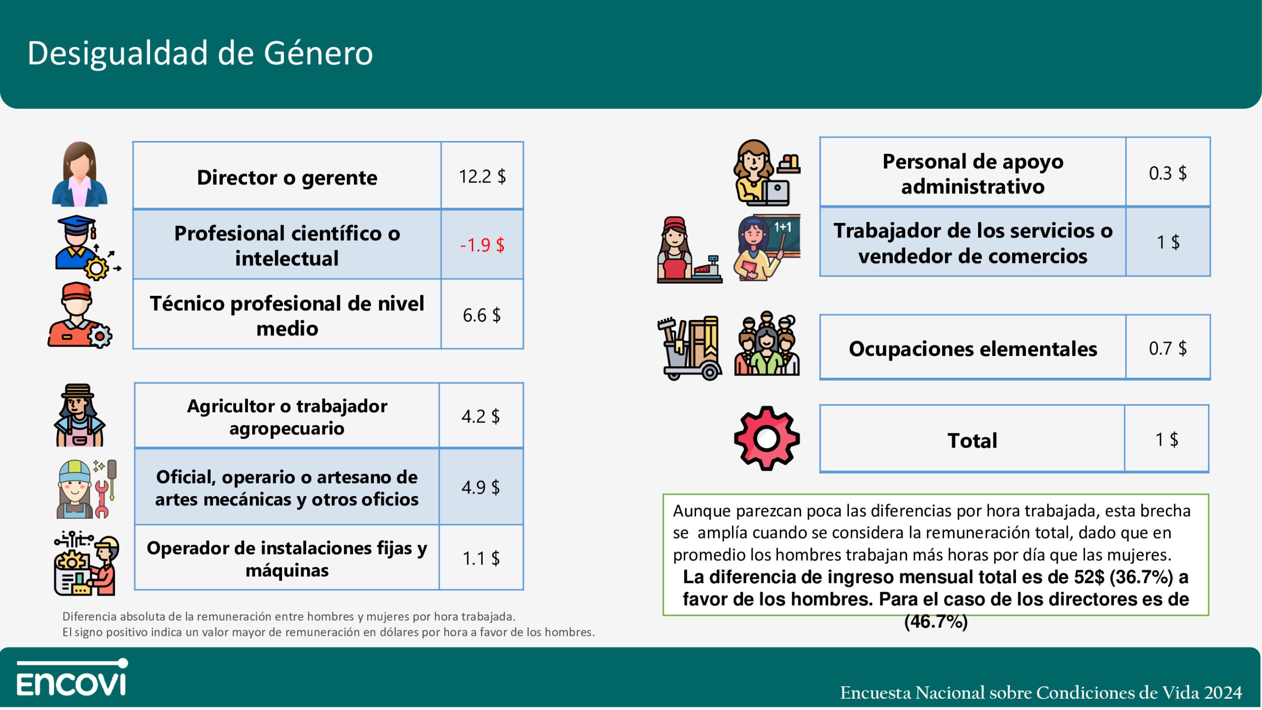 “Aunque parezcan pocas las diferencias por hora trabajada, esta brecha se amplía cuando se considera la remuneración total, dado que en promedio los hombres trabajan más horas por día que las mujeres. La diferencia de ingreso mensual total es de 52 dólares (36,7%) a favor de los hombres. Para el caso de los directores es de 46,7%”, apunta la ENCOVI.