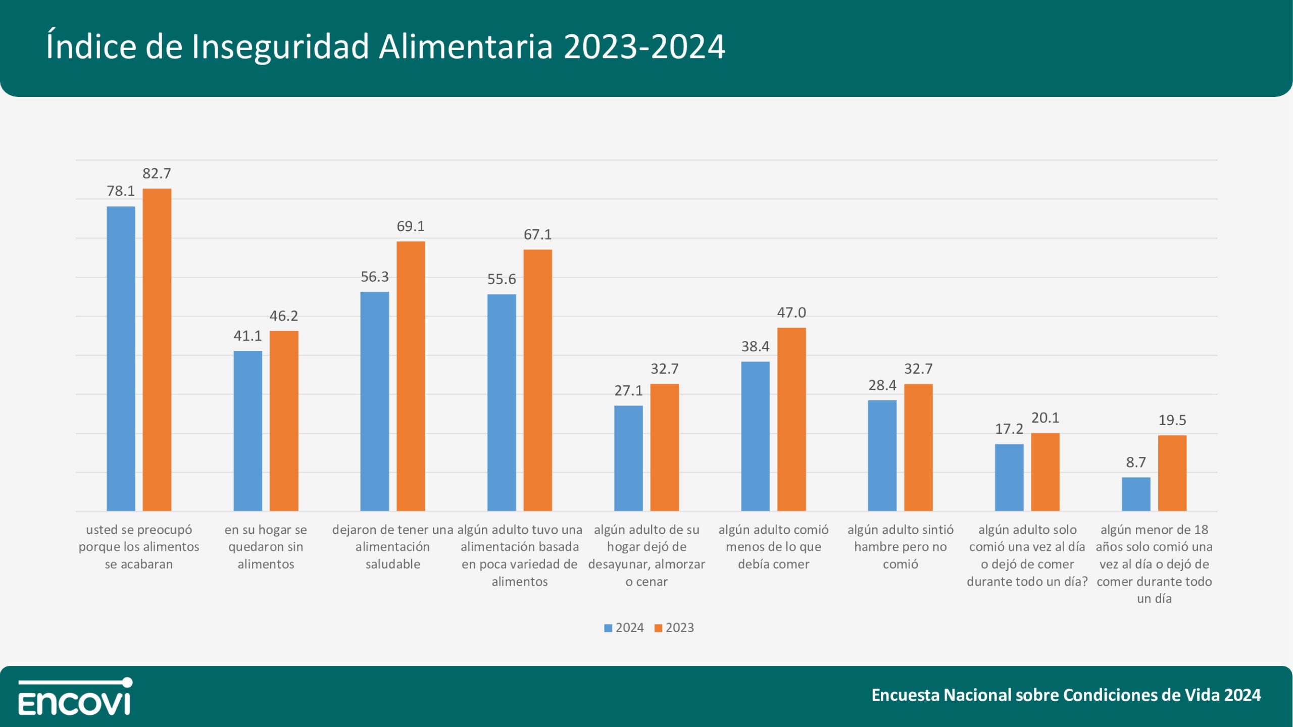 Según la ENCOVI 2024, también disminuyó la percepción de inseguridad alimentaria: 78,1% de los encuestados dijo preocuparse ante la posibilidad de que los alimentos se acabaran, versus el 82,7% que lo manifestó en 2023, y 41,1% afirmó haberse quedado sin alimentos en su hogar (4,1% menos respecto al 46,2% que lo indicó en 2023).
