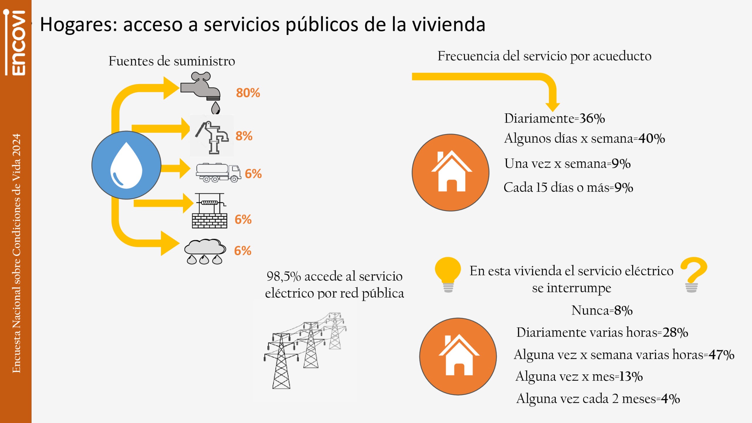Por otra parte, la ENCOVI indica que se mantienen las deficiencias en los servicios públicos: 58% de los hogares tiene suministro irregular de agua potable (9% cuenta con el servicio solo cada 15 días o más), mientras casi la mitad de (47%) reportó interrupciones en el servicio eléctrico alguna vez por semana y por varias horas, y 28% sufre apagones diarios.