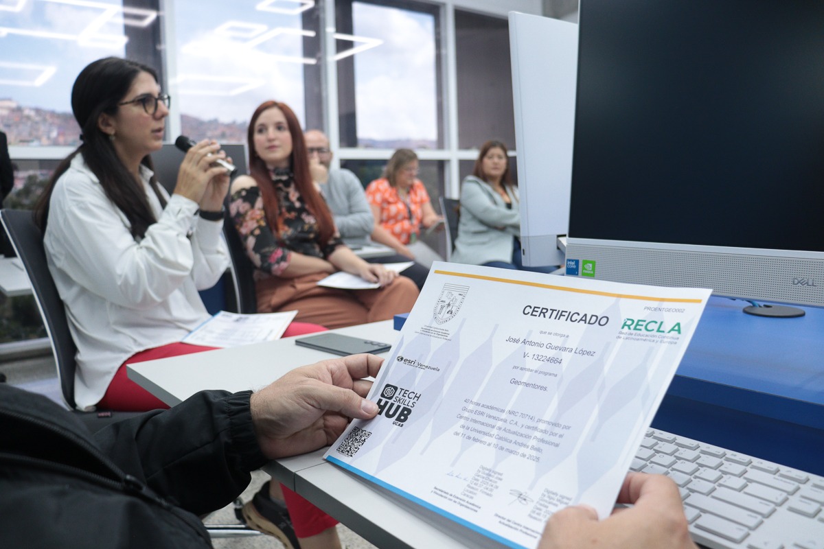 Desde el Tech Skills Hub UCAB, la empresa estadounidense con sede en el país Esri Venezuela (Environmental Systems Research Institute, por sus siglas en inglés) ofreció un curso de capacitación para que profesores de la UCAB se convirtieran en geomentores de la universidad. De esta primera cohorte egresaron 10 docentes (tanto de Caracas como Guayana) el pasado 11 de abril.