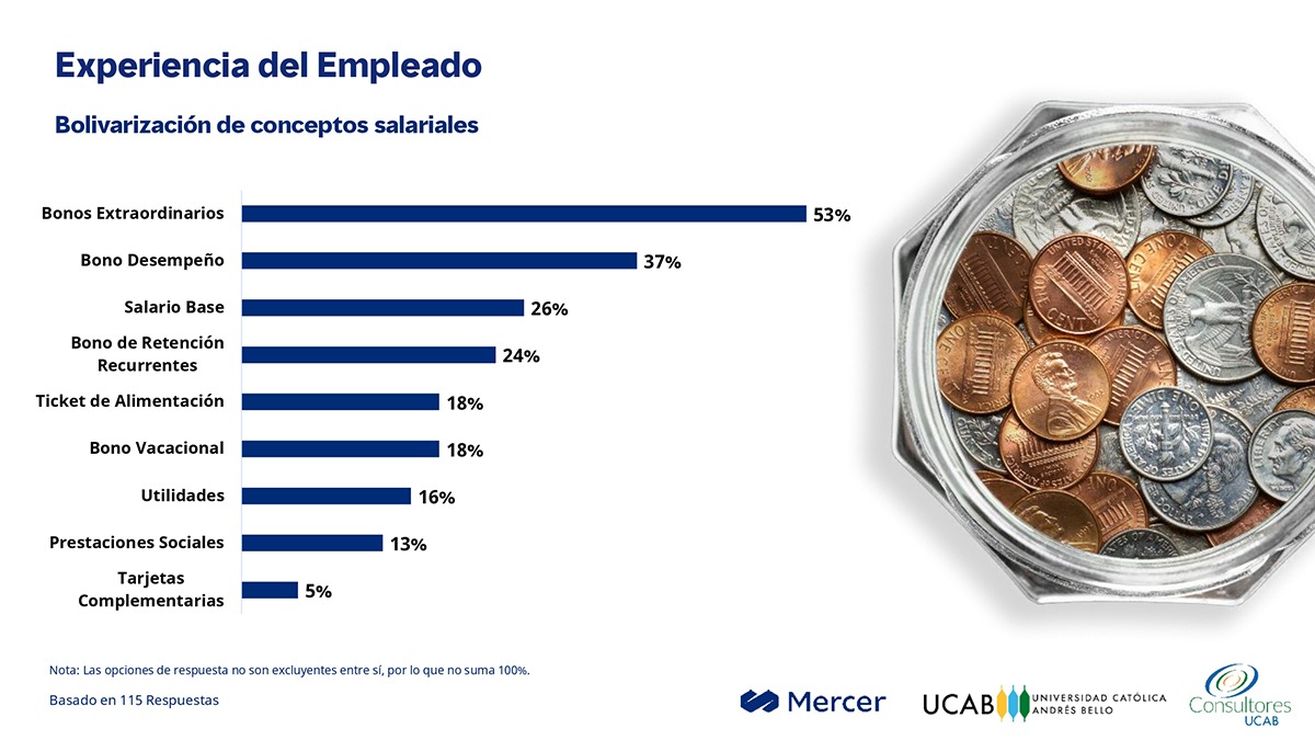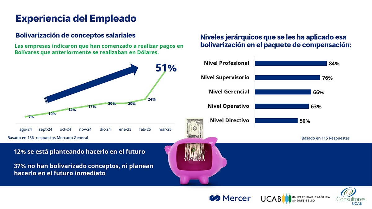 “Los esquemas de pago en moneda extranjera están desapareciendo de la compensación de los trabajadores. Principalmente es el bolívar lo que está presente y la tasa que se usa es la del BCV. ¿Esto a que se debe? A que más del 70% de lo que las empresas facturan lo están recibiendo en bolívares. La cobranza de las empresas pasó de moneda extranjera a bolívares y, por ende, tienen cada vez menos divisas para honrar los compromisos que adquirieron en algún momento con los trabajadores en esa moneda», afirmó José Adelino Pinto, líder de Mercer Venezuela, quien recomendó a los representantes de las compañías explicar esta realidad financiera a sus colaboradores con completa transparencia.