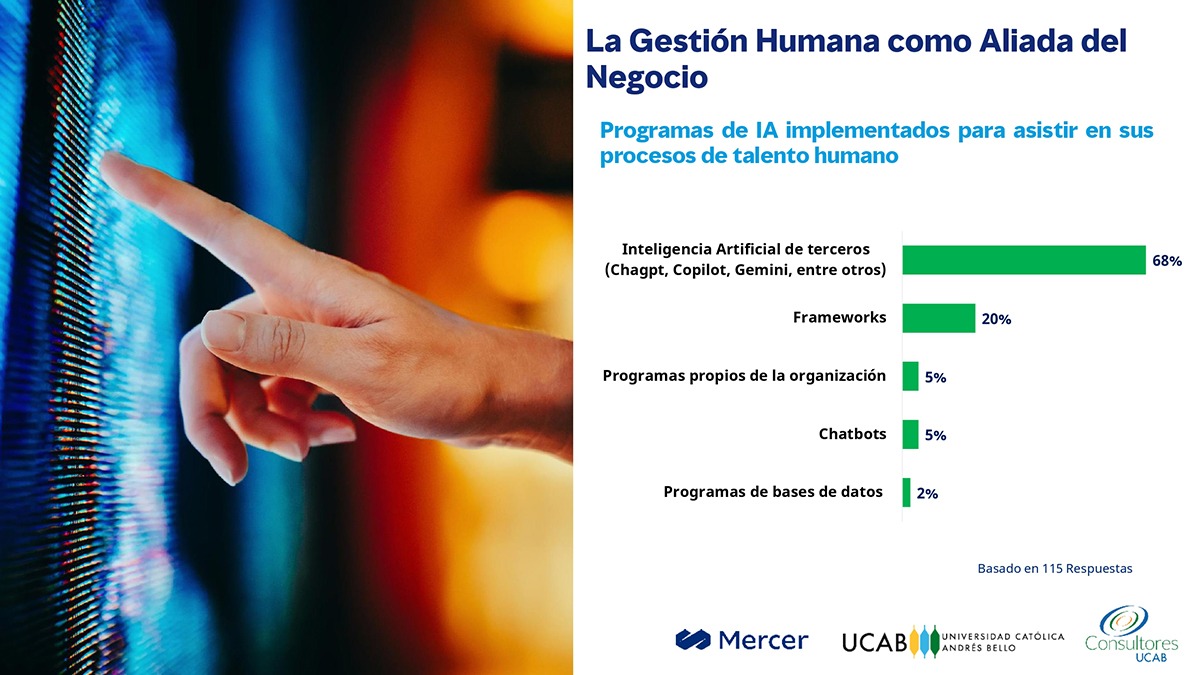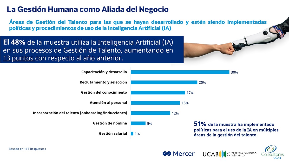De acuerdo con el sondeo, realizado en 115 empresas privadas de distintos sectores, 60% de las unidades de recursos humanos apoya procesos de transformación digital adelantados en las compañías y casi la mitad recurre a herramientas de IA para ejecutar sus estrategias. La investigación también revela que las organizaciones empleadoras están reduciendo el uso de monedas extranjeras en el pago de conceptos salariales y no salariales y que constituye un desafío garantizar sueldos competitivos para retener a los colaboradores