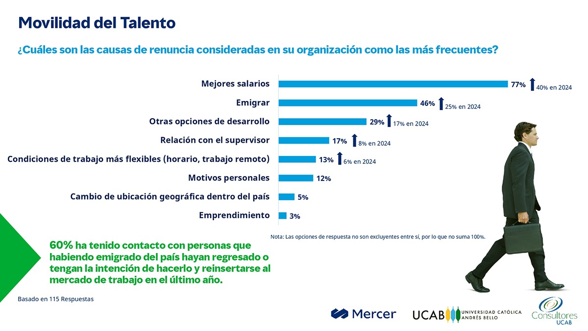 Conseguir mejores salarios es la principal razón de renuncia reportada por los trabajadores a las empresas (que subió de 40% en 2024 a 77% a 2025), seguida por la emigración (pasó de 25% a 46%) y la búsqueda de otras opciones de desarrollo (subió de 17% a 29%).