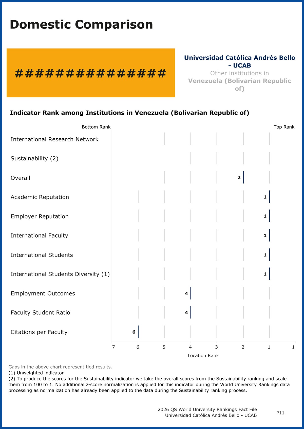 Nuevamente, la Universidad Católica Andrés Bello quedó de primera en el país en reputación académica y reputación entre empleadores, y se ubicó entre las 400 más destacadas del mundo en estas dos áreas. Para el listado se evaluaron más de 8.400 casas de estudio de 106 naciones. La UCAB mejoró su desempeño en la mayoría de las categorías en las que fue analizada y consiguió el segundo lugar nacional