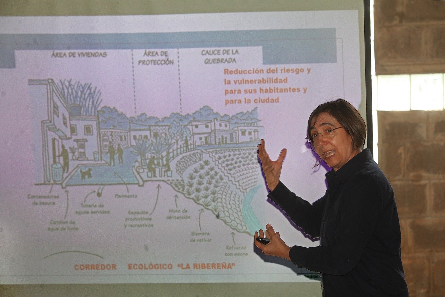 Comentó la arquitecta sobre los muchos desafíos existentes, pues la comunidad vive en riesgo permanente, ya que «la quebrada es un ente vivo», aunque el miedo al caudal lo combaten con conocimiento para tener una relación diferente con el agua.