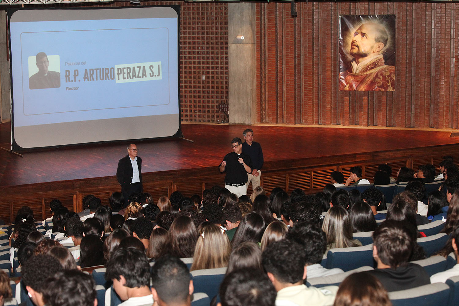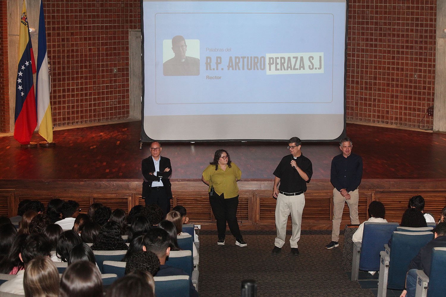 En el Aula Magna del campus Montalbán, el rector de la universidad, Arturo Peraza, S.J., acompañado por el vicerrector académico José Francisco Juárez; el vicerrector de Identidad, Desarrollo Estudiantil y Extensión Social, Néstor Luis Luengo, y la secretaria Magaly Vásquez, ofreció las palabras de apertura de la ceremonia de bienvenida.