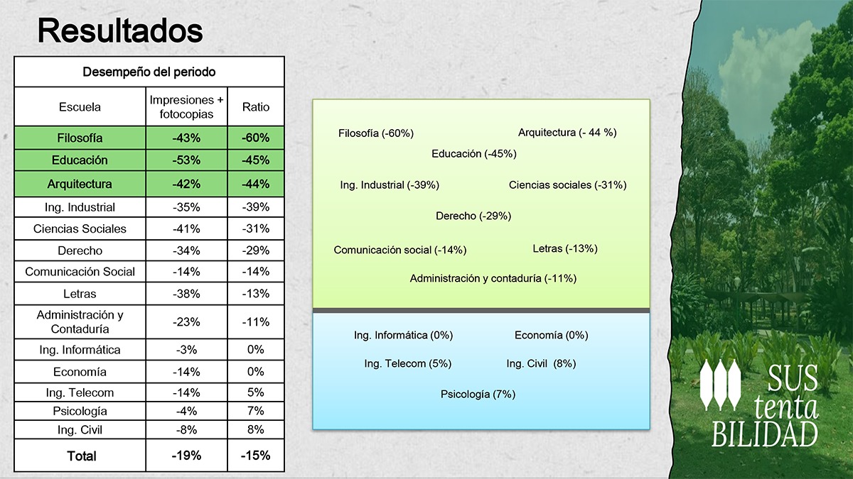 Las cifras ofrecidas por el ingeniero certifican que el esfuerzo de las 14 Escuelas rindió frutos. En términos absolutos, estas dependencias disminuyeron en 19,4% el total de impresiones y fotocopias, al pasar de 167.096 hojas (equivalentes a 33 árboles) en el semestre septiembre 2024-enero 2025 a 134.667 hojas (equivalentes a 26,2 árboles) en el semestre marzo-julio 2025.
