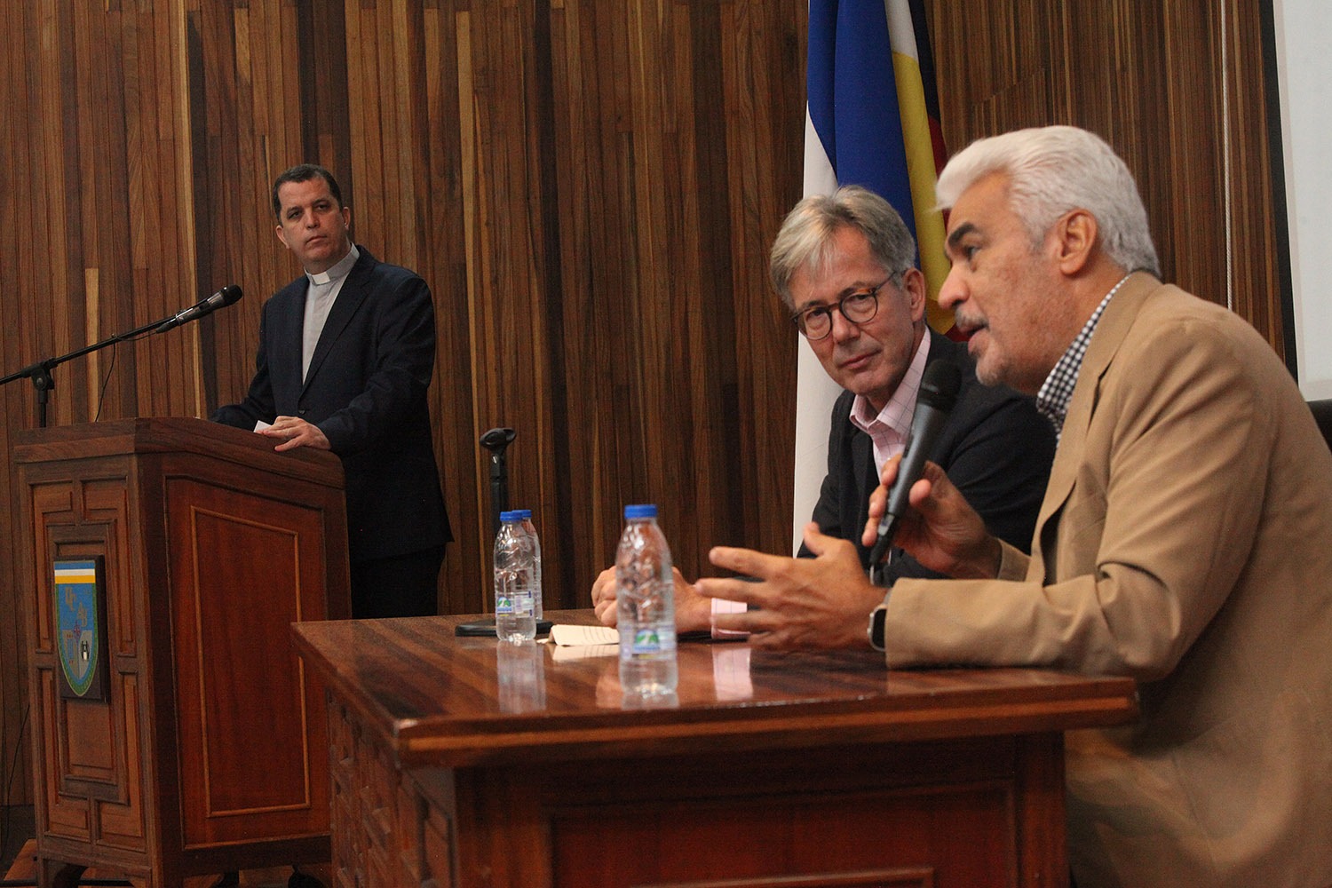En su intervención como presentador del evento, el director de la Escuela de Psicología UCAB, Danny Socorro, S. J., (quien agradeció al embajador Pellet el apoyo de Alemania al proyecto Psicodata) destacó cómo el mundo experimenta en la actualidad los riesgos vinculados con regímenes políticos autoritarios.