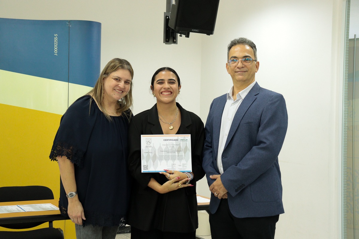 Yasmín Trak, directora de la Escuela de Comunicación Social; Vanessa Quintas, directora de la Escuela de Administración y Contaduría; Rafael Lara, director de la Escuela de Ingeniería Informática; y Joao De Gouveia, director de la Escuela de Ingeniería Industrial, entregaron los reconocimientos a los estudiantes.