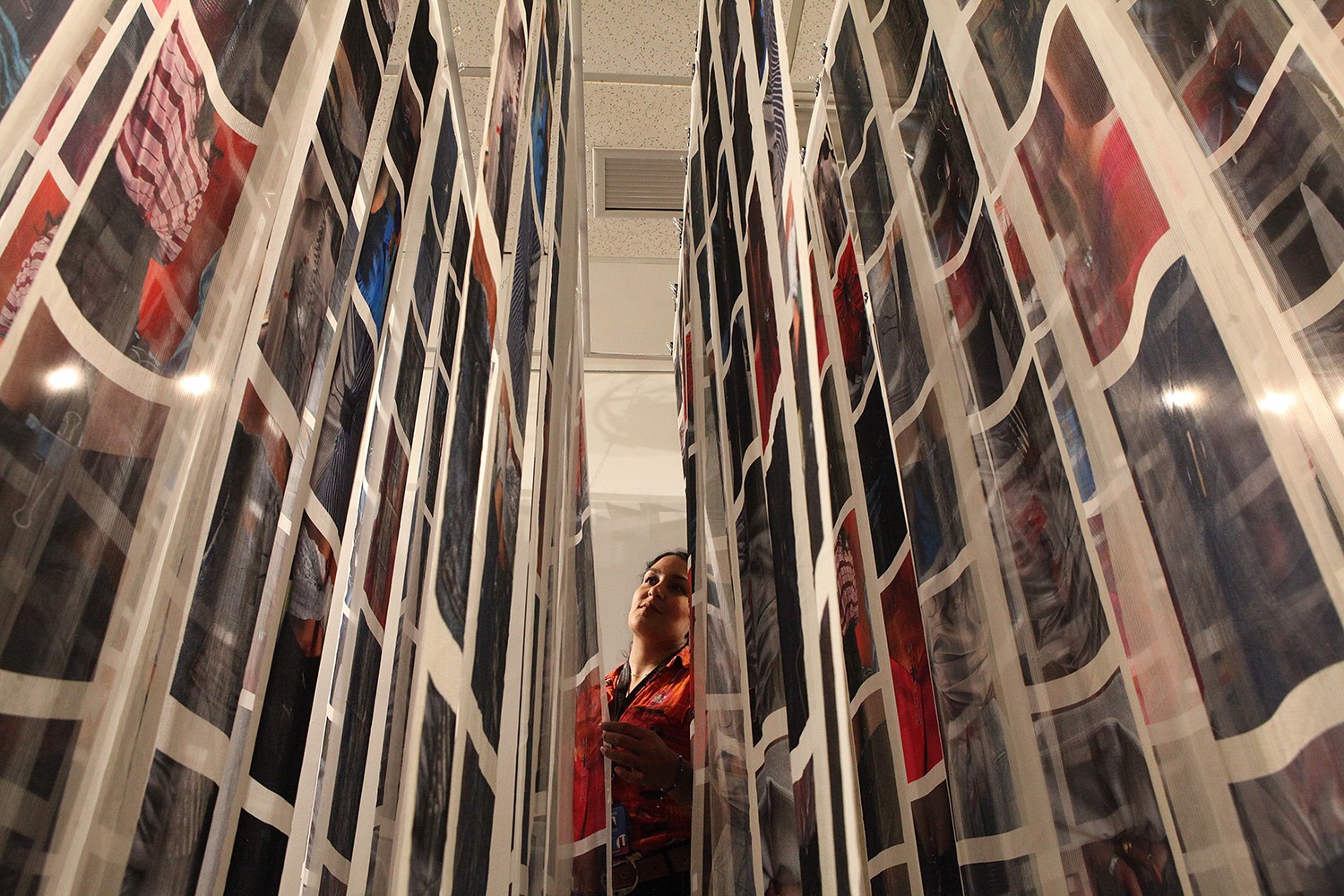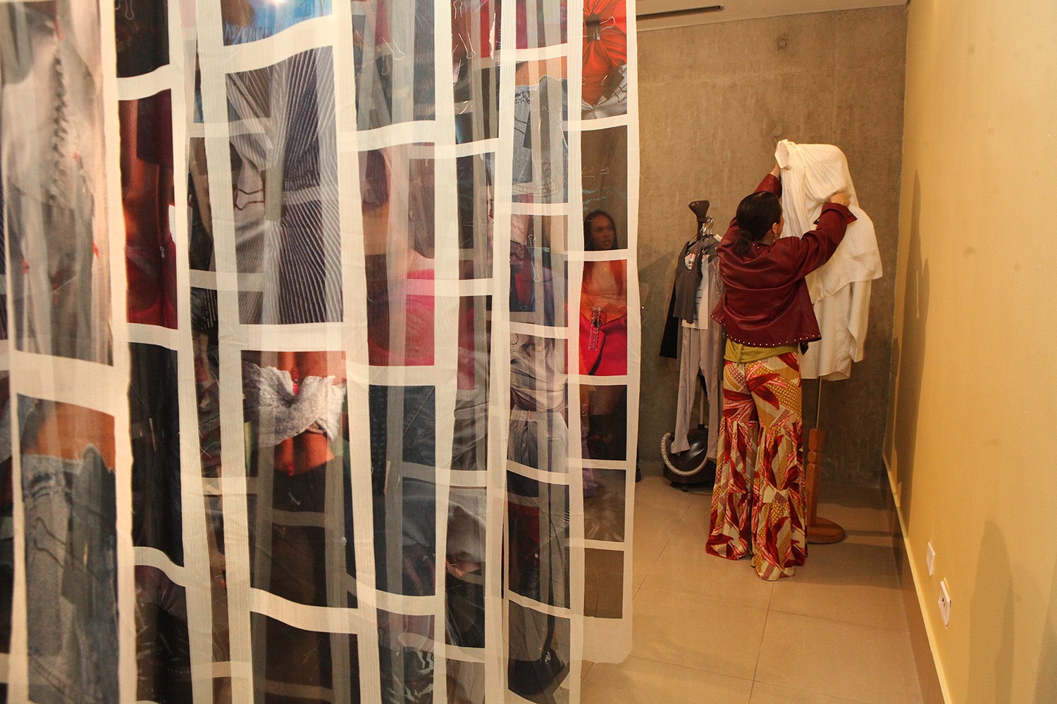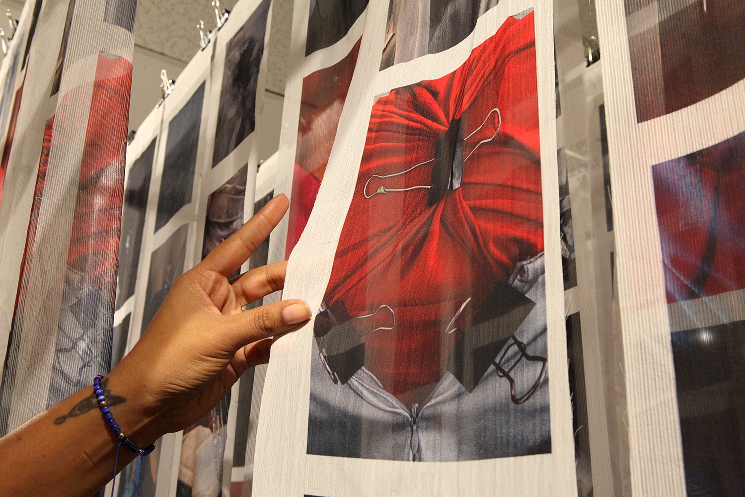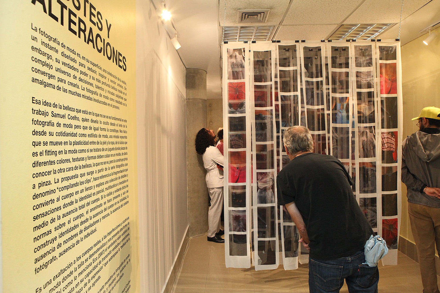 Las fotografías de «Ajustes y Alteraciones» están impresas en más de 120 telas suspendidas para que los visitantes miren, toquen y se sumerjan, a su gusto, en una suerte de bosque o laberinto en el que saltan a la vista, en primer plano o close up, cuerpos de distinto volumen con vestidos, jeans o blusas precisamente ajustados gracias a las pinzas.