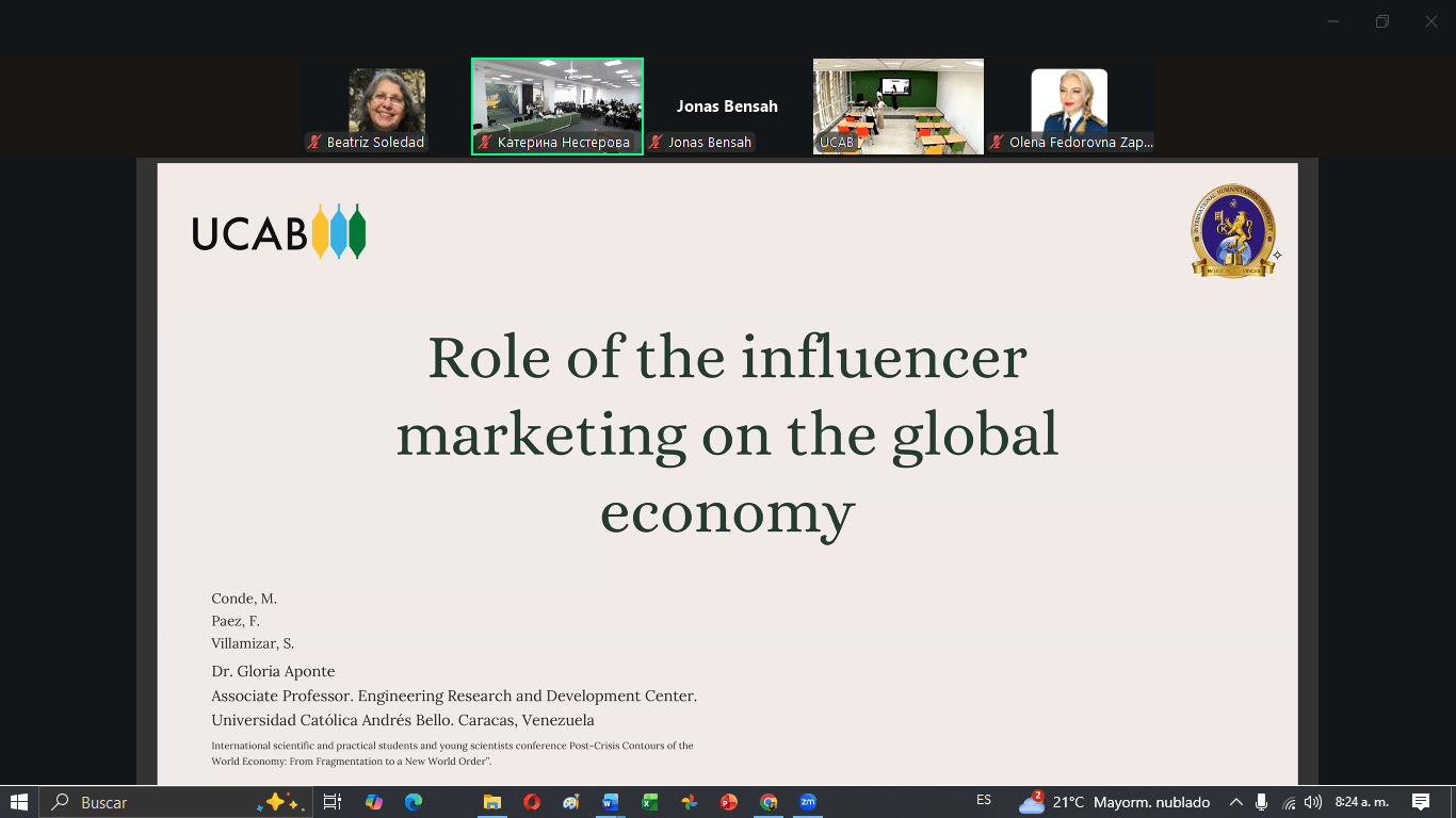 - «The role of influencer marketing in the global economy» (“El papel del marketing de influencia en la economía global”), desarrollada por S. E. Villamizar, F. A. Páez y M. H. Conde, de la cátedra Gerencia de Proyectos Comunicacionales, con la guía de la profesora Gloria Aponte.