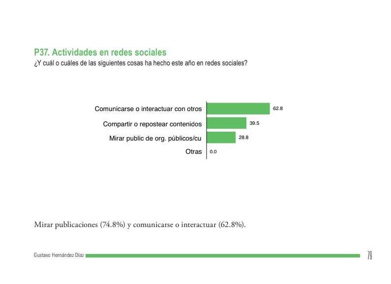 De acuerdo a los resultados, las personas recurren mayoritariamente a las redes sociales para comunicarse e interactuar con otros (62.8%) y compartir o repostear contenido (39.5%).