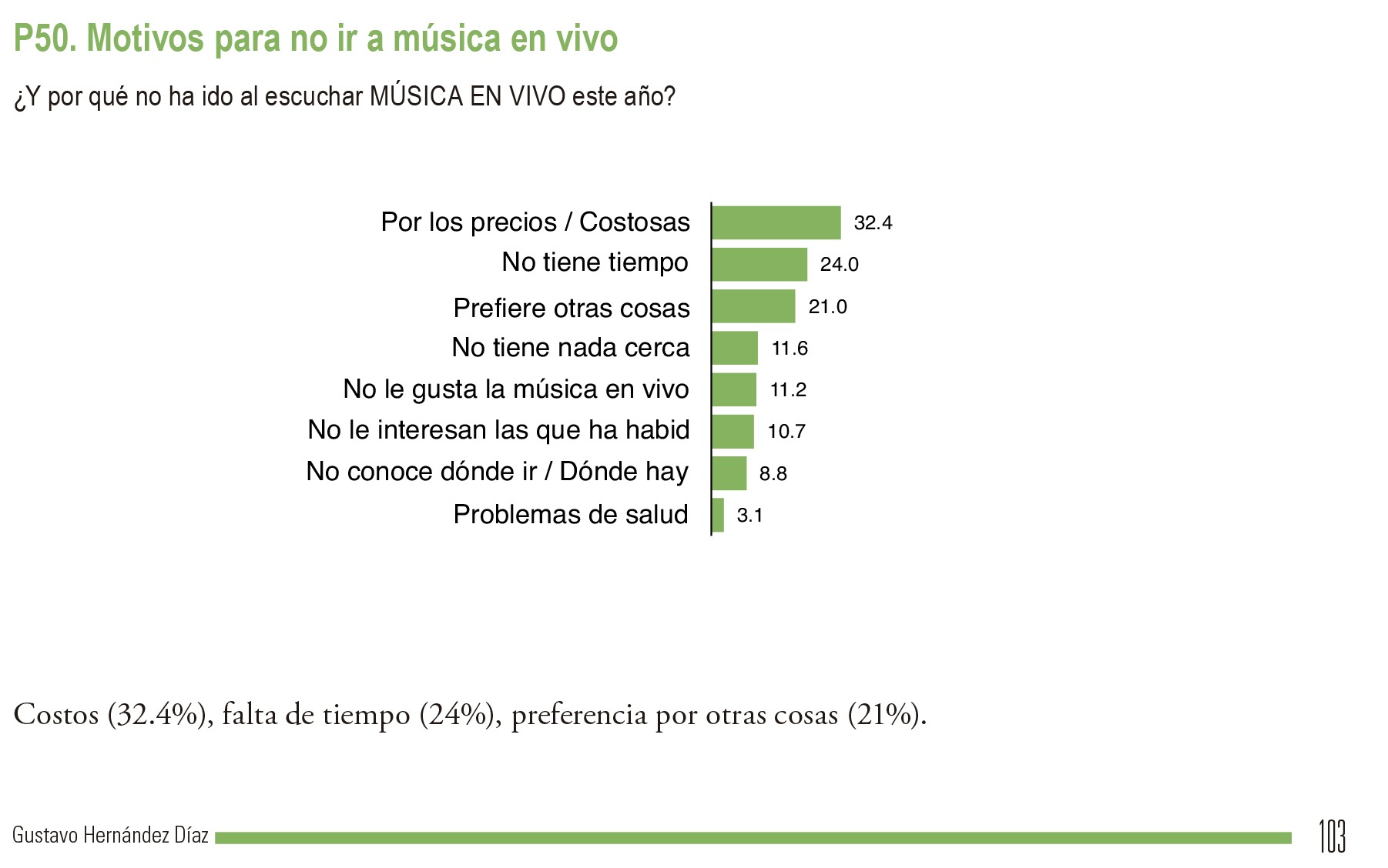 El costo de los tickets fue la principal razón para no disfrutar de estos espectáculos (32,4%), seguida por la falta de tiempo (24%) y otras preferencias (21,9%).