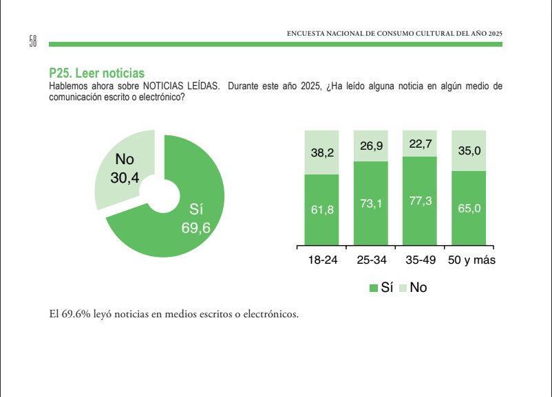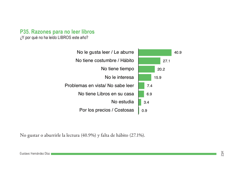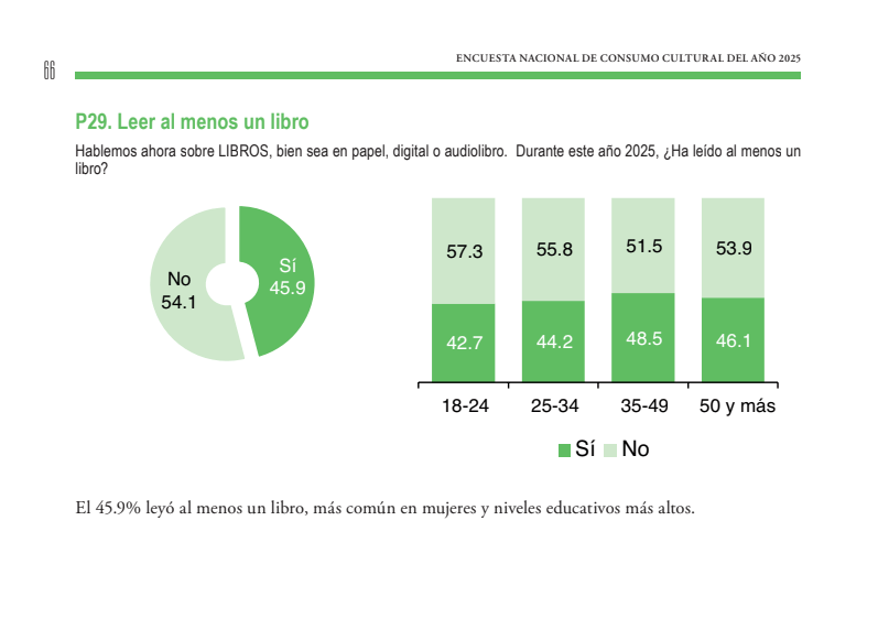 Finalmente, la Encuesta Nacional de Consumo Cultural deja ver que la lectura de libros no es importante, al menos no para la mayoría. Menos de la mitad de los encuestados (45.9%) reportó haber leído al menos un título bibliográfico durante el año. Entre quienes no lo hicieron, cuatro de cada diez afirmaron que no les gusta o les aburre hacerlo, mientras 27,1%, es decir, casi un tercio, no tiene el hábito.