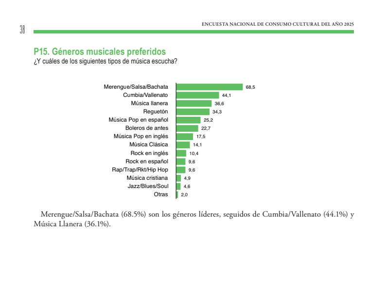 Los ritmos latinos (salsa/bachata/merengue) son los géneros favoritos para el 68,5% de los encuestados, seguidos por la cumbia o vallenato (44,1%), la música llanera (36,6%) y el reguetón (34,3%).