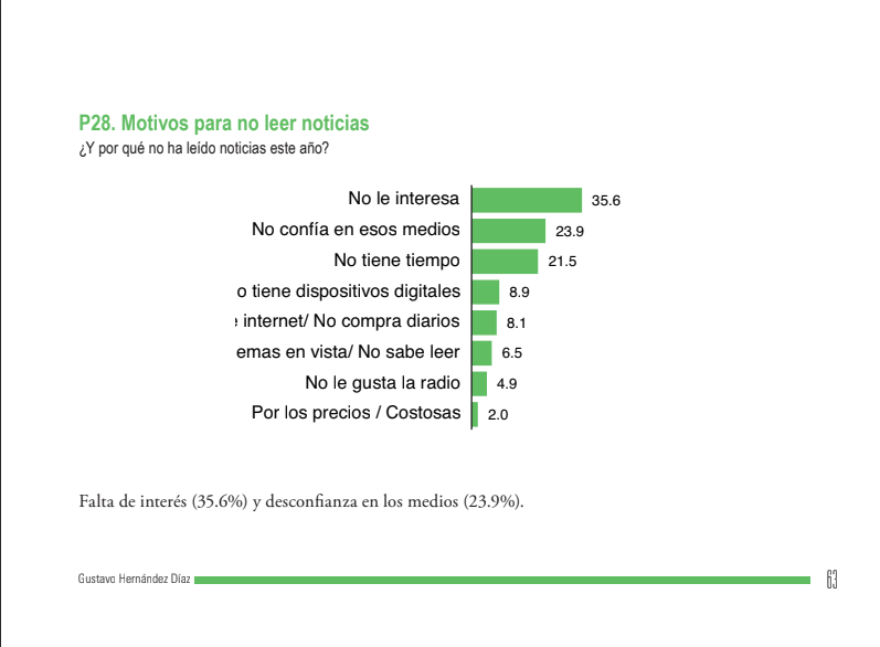 Entre los principales argumentos de quienes no consumen noticias está la falta de interés (35,6%), la desconfianza en los medios (23,9%,) y la falta de tiempo (21,5%).