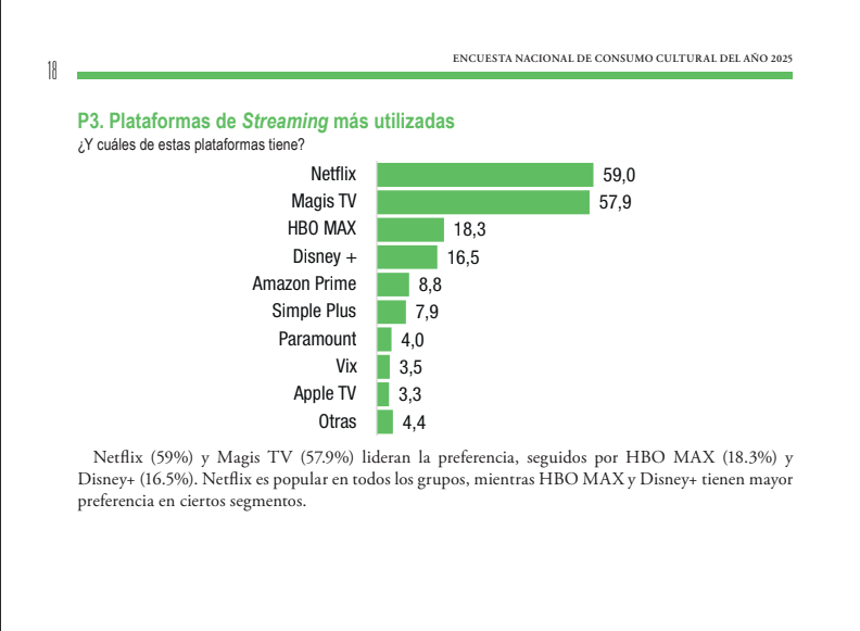 Netflix y MagisTV (esta última de carácter ilegal) son los dos sistemas predilectos, pues 59% y 57,9% de la muestra, respectivamente, aseguró utilizarlos. Le siguen HBO Max y Disney+, aunque muy por debajo: 18,9% y 16,5% de la población señaló tenerlos.
