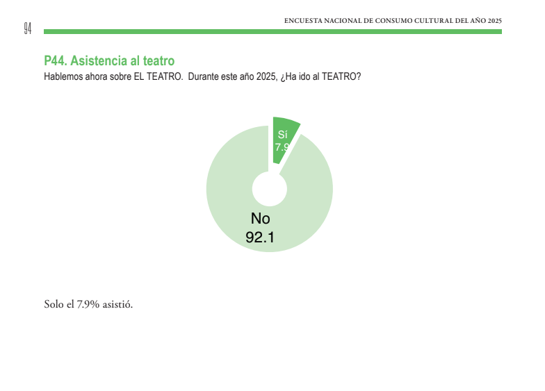 Quienes se abstuvieron de aprovechar la oferta teatral señalaron que no les gusta (32.8%), que no tienen teatros cerca (16%), que los precios de las entradas son altos (15,8%) o que no tienen ntiempo (13,4%).