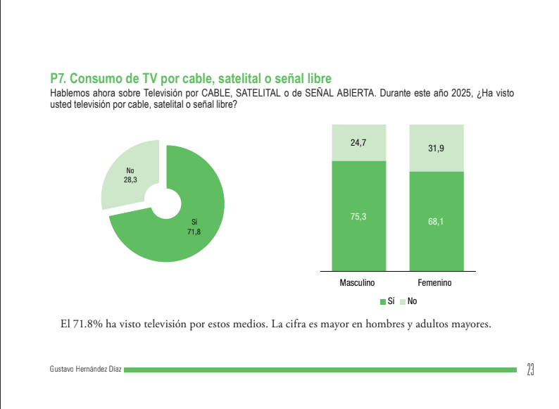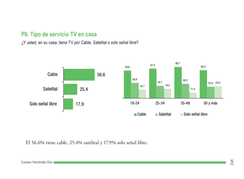 De acuerdo al sondeo, 71,8% de los encuestados ve TV y mayoritariamente lo hace a través del servicio por cable (56,6%) y el satelital (25,4%), frente a la señal libre o abierta, opción para el 17,9% de los venezolanos.
