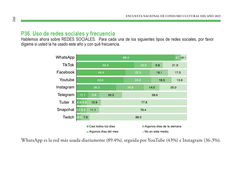 Le siguen TikTok (52.4%), Facebook (44.4%), YouTube (43%) e Instagram (36.3%).