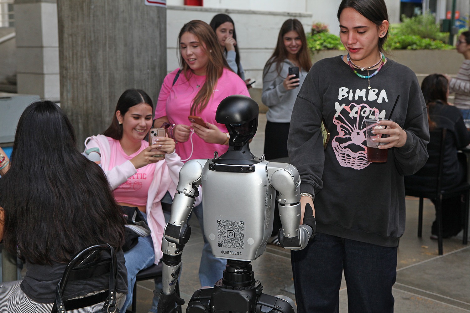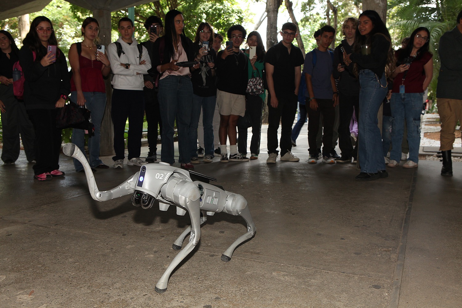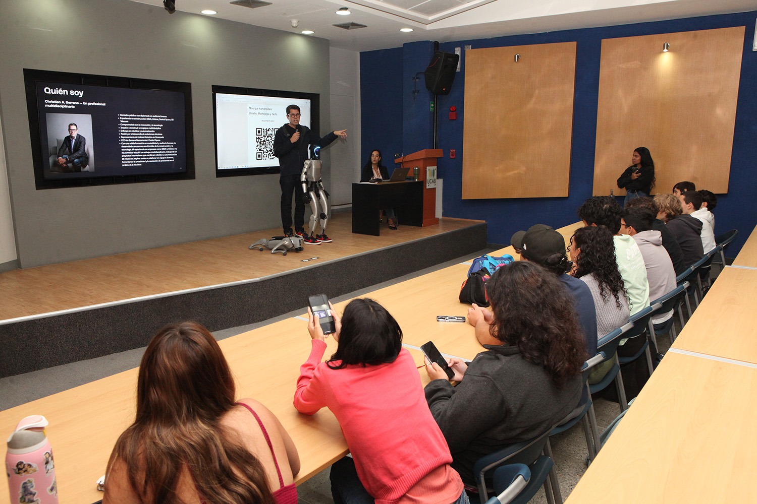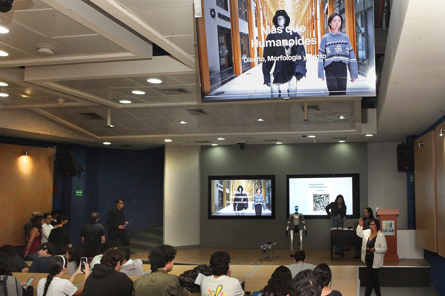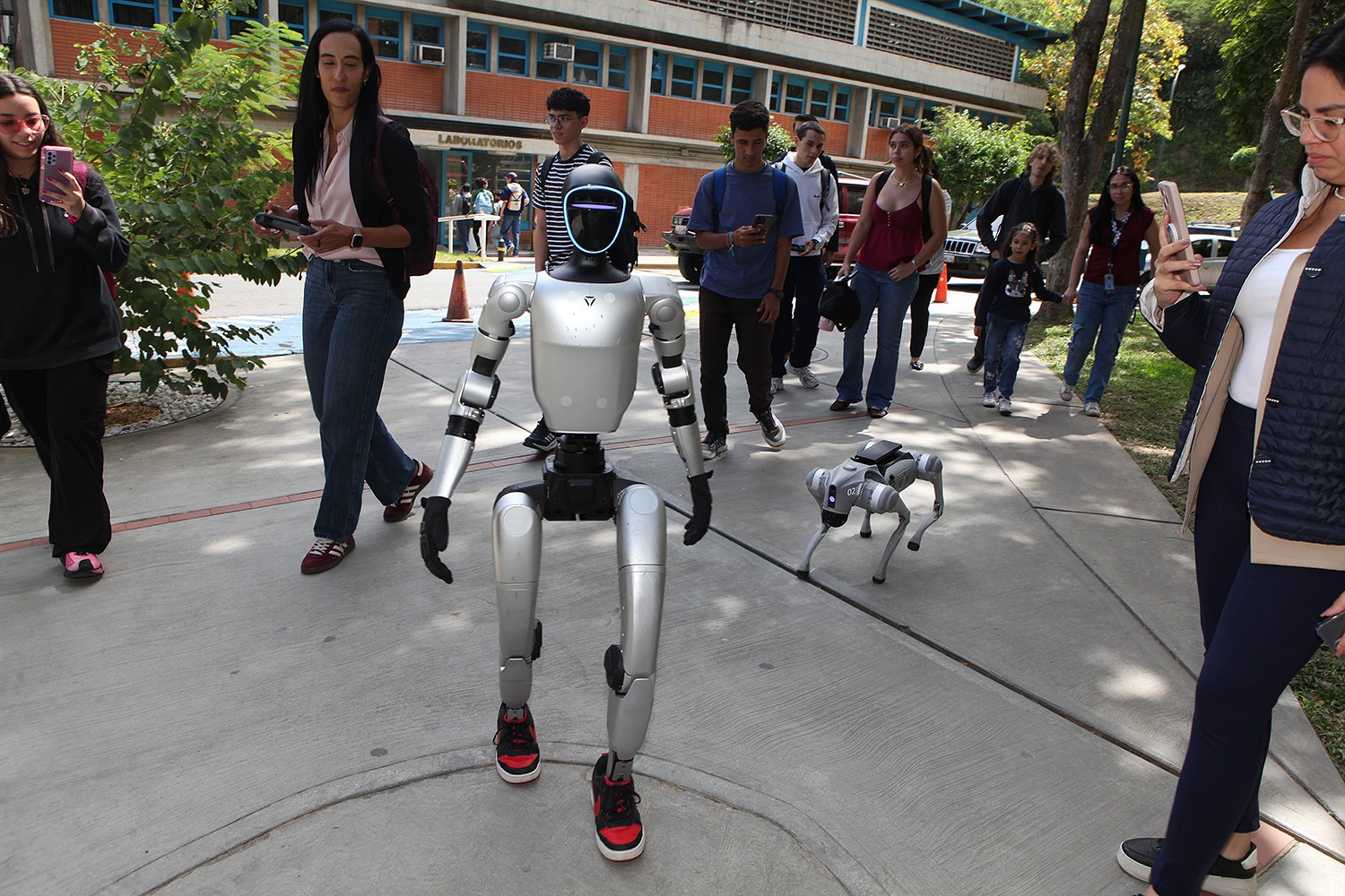 La visita de Christian Serrano a la UCAB no se limitó al encuentro con los estudiantes. Tras la conferencia, los dos modelos de robots que acompañaron al ponente recorrieron el campus y robaron la atención de los miembros de la comunidad universitaria.