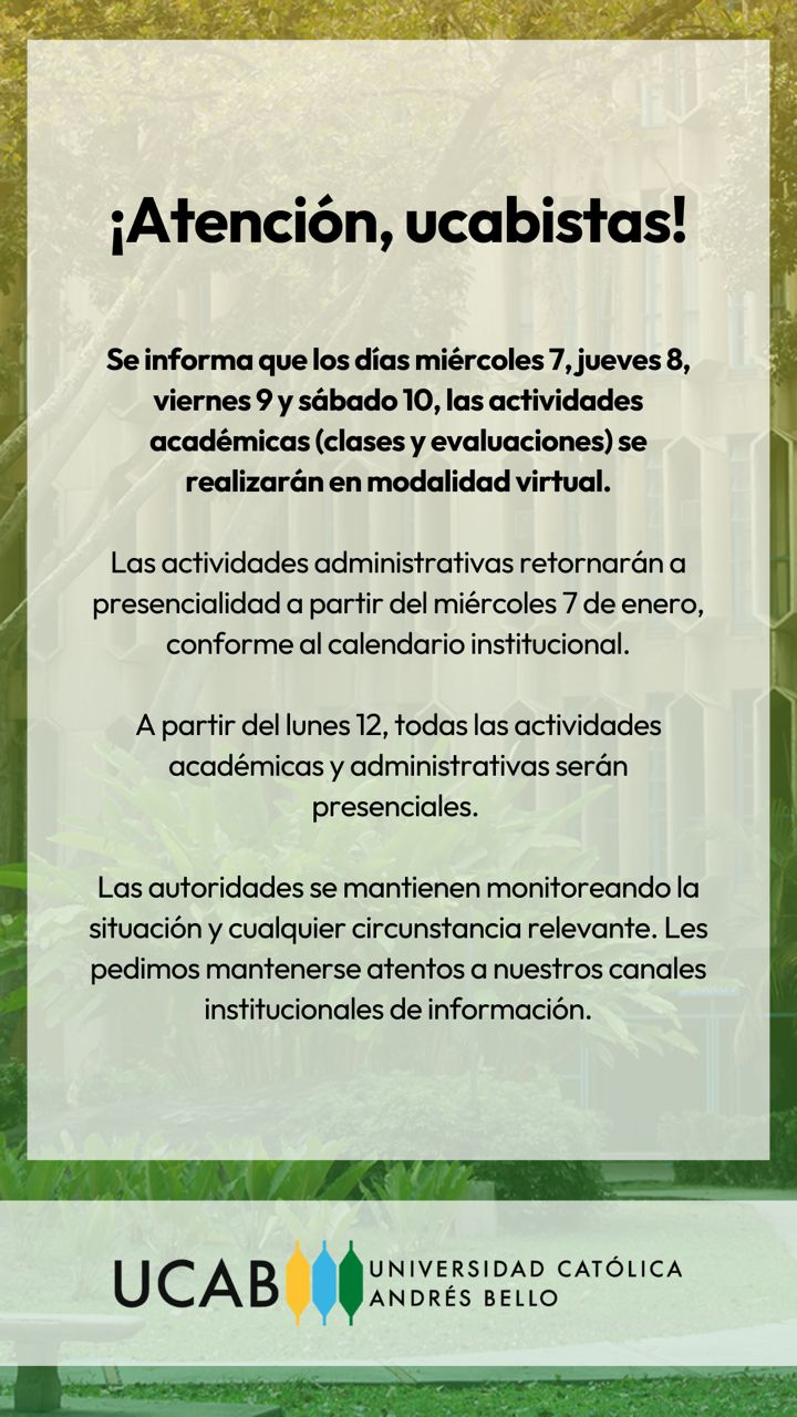 A través de un comunicado, publicado este lunes 5 de enero, las autoridades de la Universidad Católica Andrés Bello (UCAB) informaron a sus profesores y estudiantes el reinicio de actividades académicas, a partir del miércoles 7 de enero de 2026, aclarando que, entre el miércoles 7 y el sábado 10, las clases y evaluaciones se llevarán a cabo en modalidad virtual.