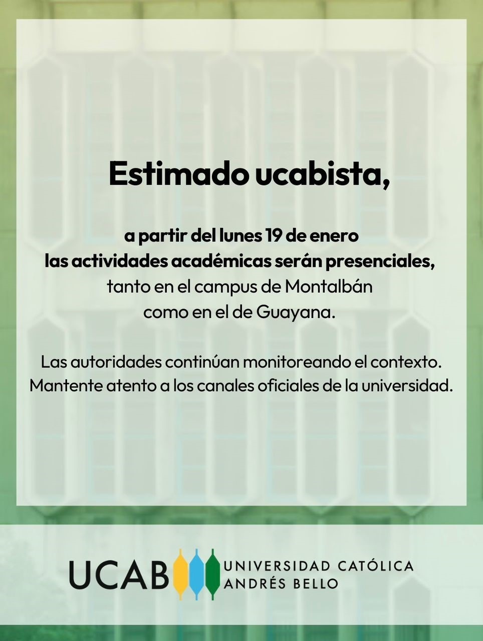 Tras dos semanas en modalidad virtual debido al contexto nacional de los primeros días de 2026, las actividades académicas (clases y evaluaciones) de la Universidad Católica Andrés Bello (UCAB) volverán a ser completamente presenciales a partir del lunes 19 de enero.